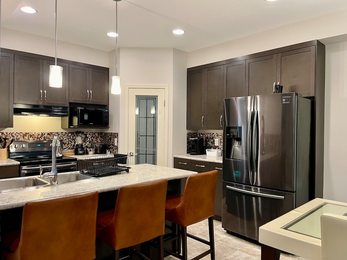 New Private built basement apartment has a functional kitchen which comes with a cooktop, fridge, microwave, kettle, coffee brewer, cutlery as well as basic cooking and serving utensils for your use. The room is with all the comfort of a home, queen and sofa beds that are warm and cozy for a perfect sleep. All rooms have Smart TVs. Fresh/clean towels are provided. It is located in the serene environment of the city with a functional Transit bus system. Parking spot available.