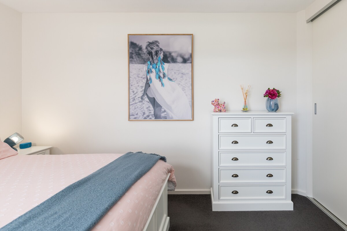 Relax in our cozy, beach-inspired two-bedroom, two-bathroom apartment just minutes from Eastern Beach, Geelong City, and Geelong Station. Enjoy calming water views from your private balcony, a basic equipped kitchen, and the convenience of your own parking space. Guests also have access to a shared gym and outdoor BBQ area. Self check-in makes arrival simple. No pets or smoking allowed. Ideal for couples, families, or business travelers seeking a comfy, coastal escape with all the essentials.