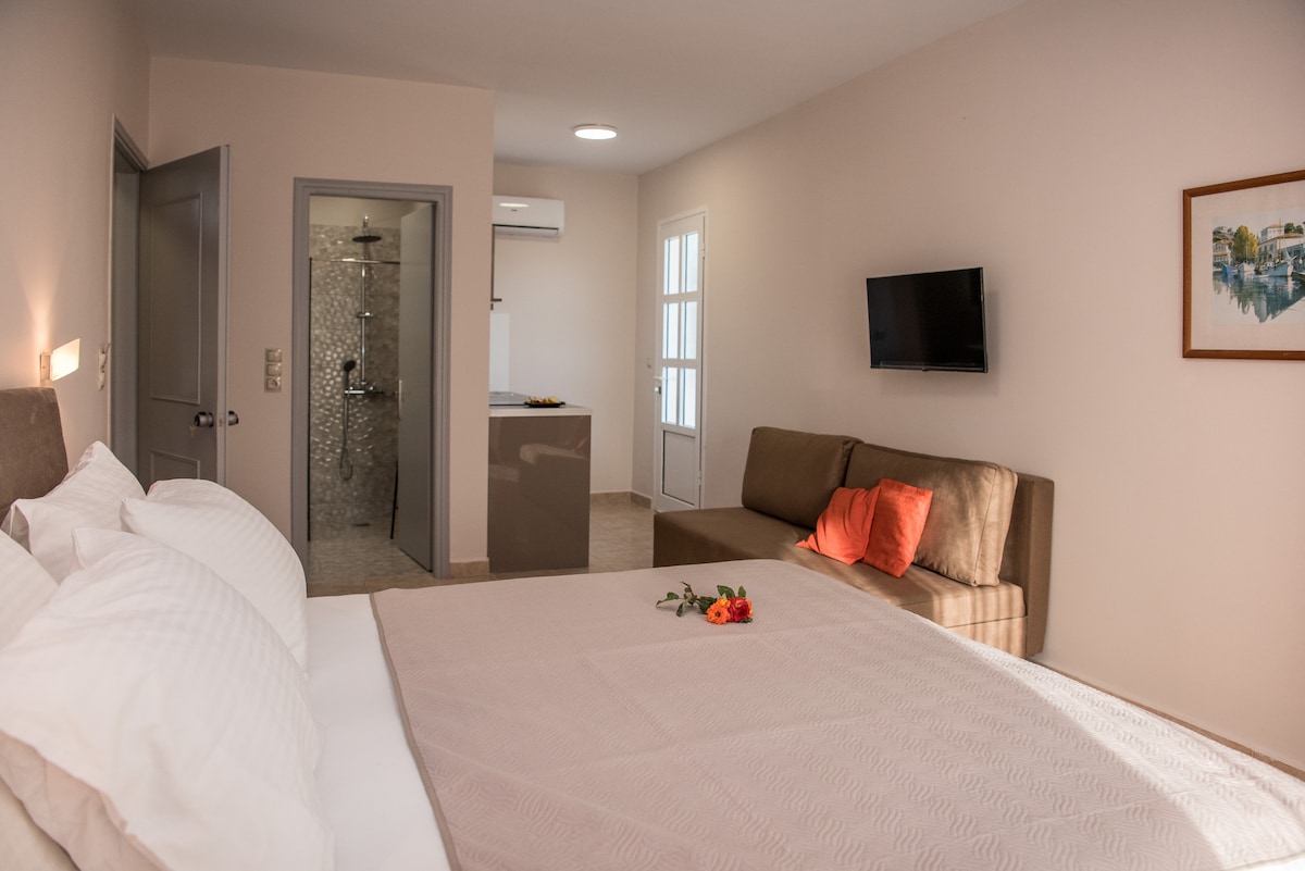 Kapetanios stúdiók mindössze 2 perc sétára az egyik legnagyobb és legnagyobb homokos strand a szigeten. A közelben szupermarket, strand bár, éttermek, bárok és kávézók találhatók. A stúdiók felszereltek. 1-3 fő részére, csendes környéken. Nagyszerű a családoknak is. Nagy kert. Ingyenes wifi, légkondicionáló, nagy kert és grill.