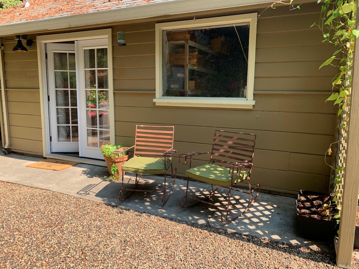 A rét, a patak és a vörösfenyők lenyűgözőek! Country setting 12 minutes to Calistoga, Napa Valley or Santa Rosa! Gyönyörű kilátás, hallgasd a víz csobogását, és igyál kávét a teraszról, ahol asztal és székek várnak. Nézd a szarvasokat a privát ablakok falán keresztül! Plüss szőnyeg, gránit pultlapok, kandalló, nagy síkképernyős TV, Netflix, DVD, könyvek, jóga felszerelés. Az elektromos kapu gyönyörű földterületre nyílik. Kiváló minőségű ágynemű. Nagy hely, konyharész, Keurig/kávékapszula vagy csepegtetős kávéfőző, saját grill és mosógép
