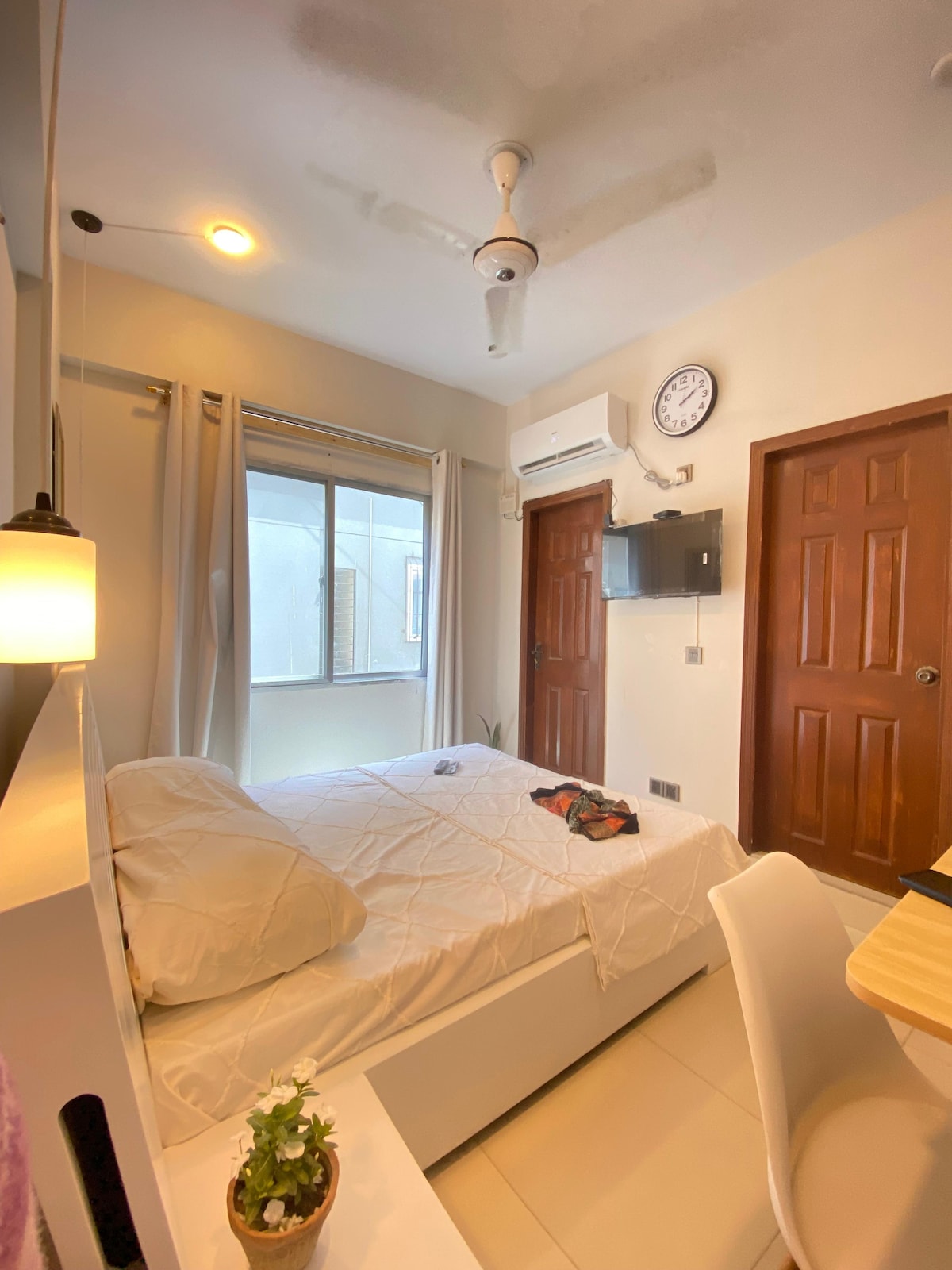 **Harmony Haven:** 1Br apartmanunk king-size ággyal, teljes Smart TV-vel, Wi-Fi-vel és légkondicionálóval rendelkezik. A Bukhari Commercial központjában található, és teljes konyhai felszereléssel, valamint szalonnal is rendelkezik. A 2. emeleten a biztonság és a magánélet védelme garantált. Élvezd az ételkiszállítást, a taxikat és az olyan extrákat, mint a kávé, a reggeli és a mosás megfizethető áron. A közelben olyan éttermeket találhatsz, mint a Coffee Bean, a Xanders és a Wang Wang, valamint a Springs. Tapasztald meg a kényelmet és a kényelmet a Harmony Havenben – a Karacsi elvonuláson.