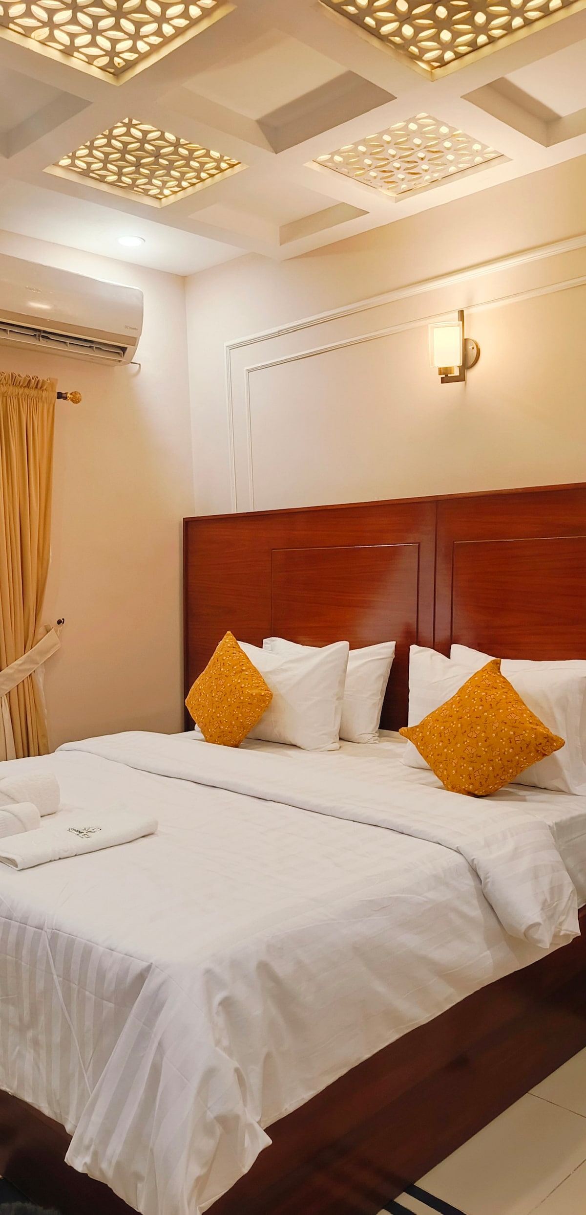 Welcome to your cozy & secure 2-bedroom apartment in DHA Phase 7 Extension! This bright, air-conditioned space offers attached washrooms, a shared kitchen, and rooftop access. Enjoy a great view, natural light, and a peaceful vibe. Located near restaurants, parks, and a bank with 24/7 security, convenience is at your doorstep. Smart TV, fast WiFi, easy check-in, and a comfy stay await! Perfect for families, solo travelers, or professionals. Book now and feel at home!