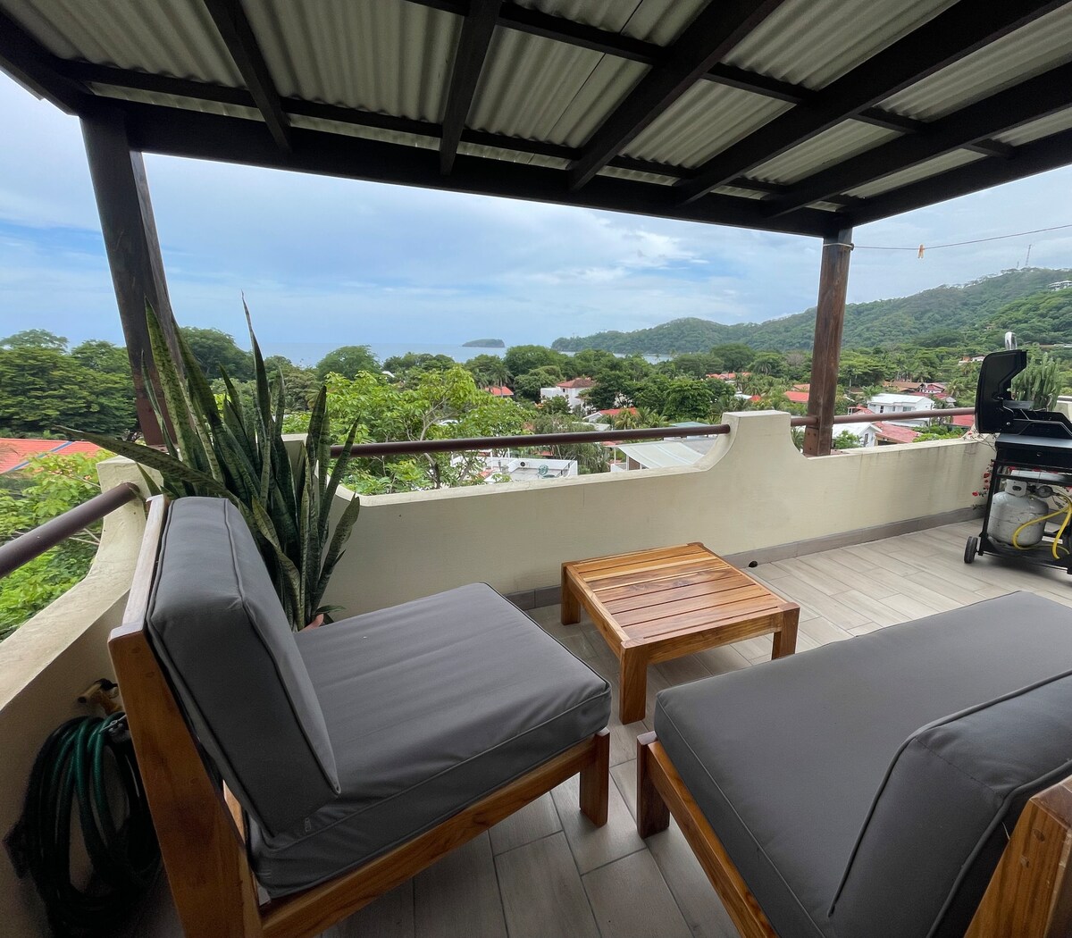 Playas del Coco egyik legjobb óceáni és hegyi kilátása! Mindenkit szívesen látunk! Tökéletes pároknak, családoknak és távolról dolgozóknak. Teljesen felszerelt ház, amely egy hegy tetején található egy zárt közösségen belül, 10 perc sétára a strandtól. Élelmiszerboltok, éttermek és üzletek a közelben. Rövid autóútra a libériai repülőtértől (20 perc). Élvezd a madarak és majmok koncertjét minden alkonyatkor és hajnalban, látványos naplemente a Playas del Cocóra néző kilátással. Közel a természethez, de nem messze az árucikkektől!