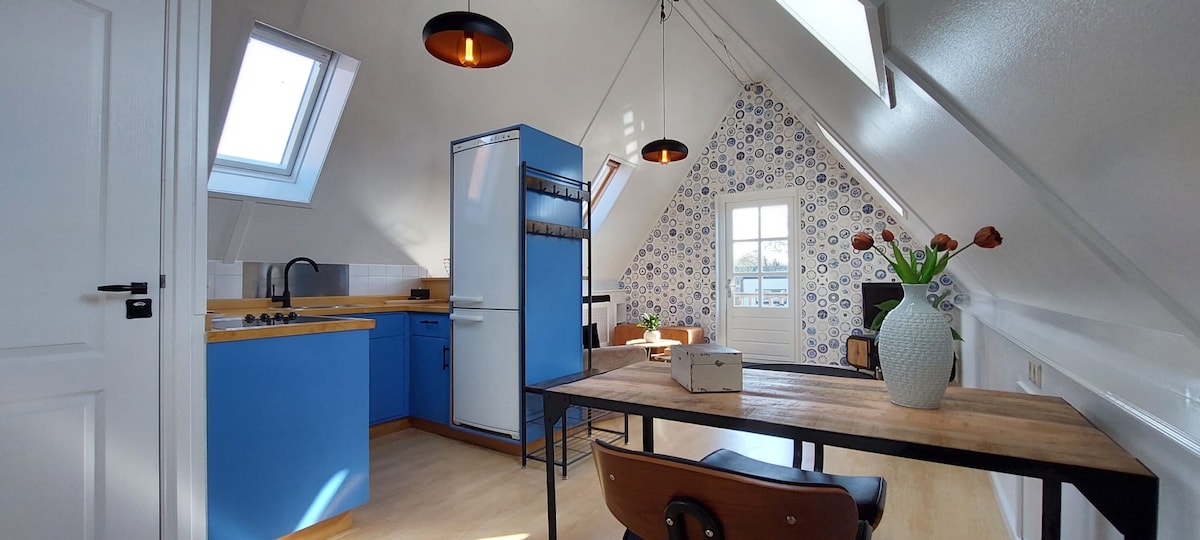 Pihenjen és lazítson ebben a békés, századközepi ihletésű vakációs stúdióban. Egy szép stúdió tágas nappalival, saját (különálló) fürdőszoba, hálószoba loft (megjegyzés: keskeny meredek lépcső) és saját terasz ülősarokkal és napernyővel. A stúdió egy tágas konyhai pult különböző konyhai létesítményekkel. A stúdió figyelemre méltóan világos a sok ablakon keresztül. Felhívjuk figyelmét, hogy a keskeny és meredek lépcsőn az alvó loft, nem alkalmas az idősek és a fogyatékkal élők számára.