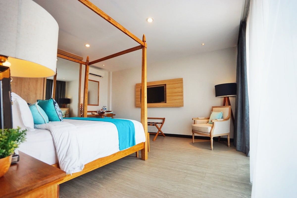 Indulge in a serene escape in this elegant 1-bedroom suite, nestled within a resort in beautiful Sanur. Designed exclusively for adults, this 40 m² suite offers breathtaking views through large glass doors that lead to your private balcony. Relax and soak in the luxurious stone bathtub with panoramic views of lush greenery and the distant sea. For beach lovers, Segara Ayu Beach is just an 11-minute drive away, while Sindhu Beach is a 12-minute drive, and Sunrise Beach is only 8 minutes away.