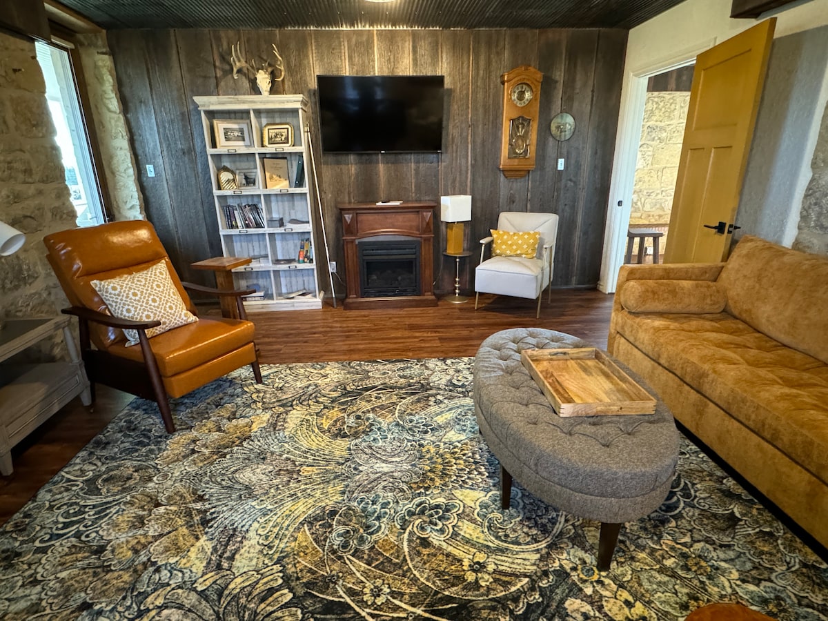 Százéves őshonos mészkőház, amelyet 2023-ban újítottak fel, Flint Hillsben - mindössze 8 percre az I70-es úttól. Szállj meg egy bevándorlók történelmével átitatott Elk Ranchen, egy Angus csordában és a közösség szeretetében. Az otthon egyszintes nappalival rendelkezik, ahol nincs lépcső, ÉS egy emelet, amely lefoglalható, ha csoportos eseményed van. A tanyasi munka minden nap zajlik, és csatlakozhatsz hozzánk egy aligátoros túrán a legelőkön. Van egy 2,2 mérföldes erdős túraútvonal és számos felfedezésre váró tó, egy lakóautó-helyszín a szálláshelyen és még sok minden más!