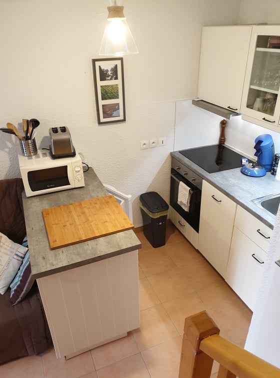 Bájos, tökéletesen felszerelt stúdió, 100 méterre a strandtól és az üzletektől. A nagyon tágas lakásban könnyen elfér 4 fő a 140 cm-es ágynak és a kényelmes kanapéágynak köszönhetően. Konyhasarok nagy munkalappal, hűtőszekrénnyel/fagyasztóval, 4 főzőlapos üvegkerámia főzőlappal, forgó sütővel, mikrohullámú sütővel, mosogatógéppel, Nespresso kávéfőzővel és vízforralóval. Tartalmazza a takarítást, az ágyneműt és a fürdőszobai ágyneműt.