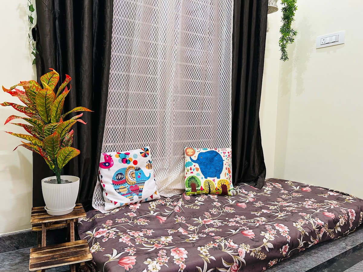 Szállj meg vadonatúj, egy hálószobás lakásunkban az Electronic City Phase 1-ben, mindössze 2 percre a Neeladri Roadtól. A békés, csendes sikátorban található hangulatos hely tökéletes két főnek, családnak, egyedül utazóknak vagy pároknak. Élvezd a pasztell témájú belső tereket, a gyors Wi-Fi-t, a teljesen felszerelt konyhát, az étkezőt, a liftet, a tartalék áramforrást és a 40 hüvelykes okostévét, ahol Netflixet nézhetsz és pihenhetsz. Ideális munkához vagy szabadidőhöz, kávézók, üzletek és technológiai parkok a közelben. Biztonságos, nyugodt épület, ahol minden megvan, ami a kényelmes tartózkodáshoz szükséges.