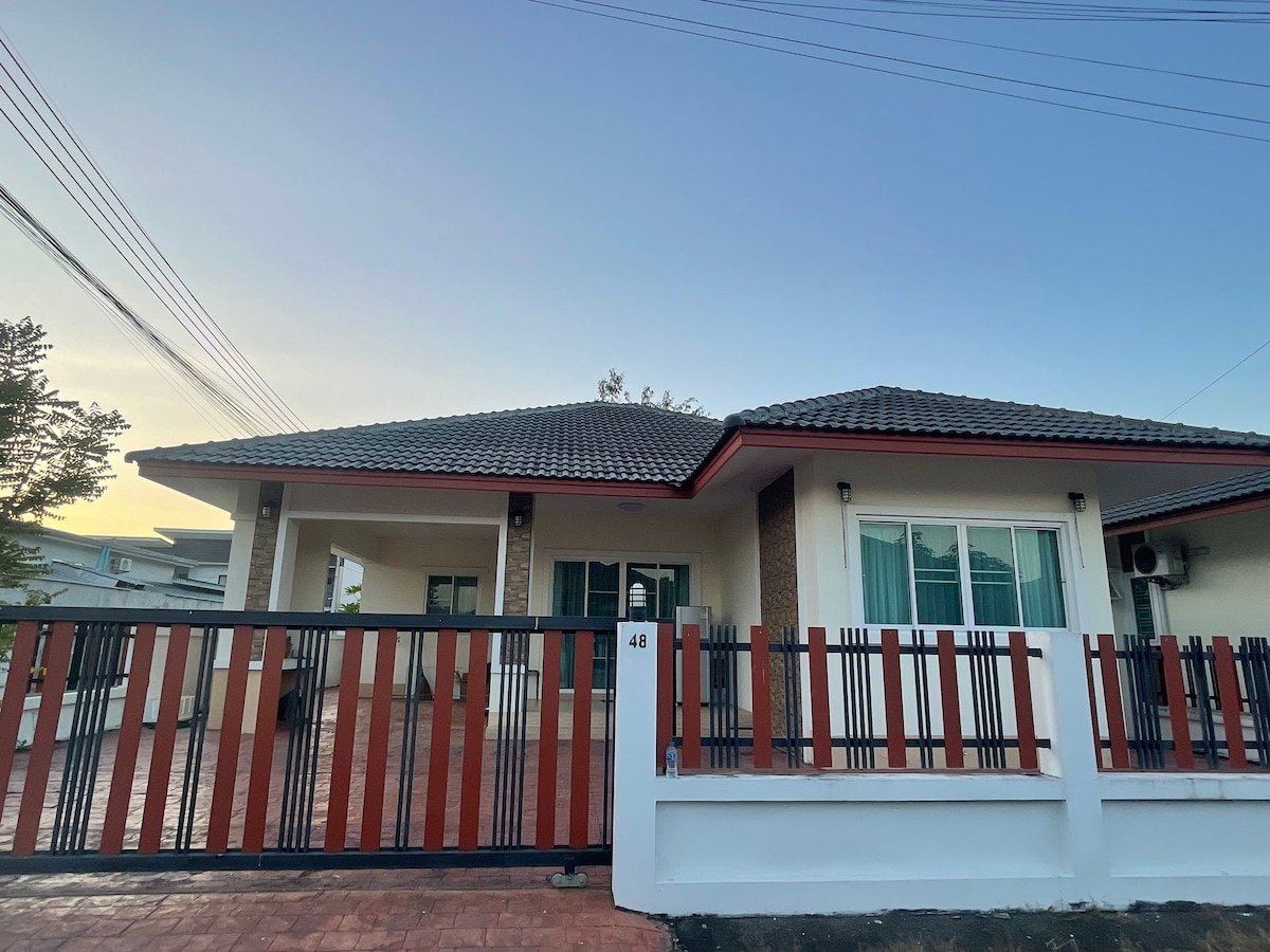 Városi otthon 1 hálószoba, 1 fürdőszoba, 1 nagy, 100 négyzetméteres nappali. A város közelében található, közel a 7/11-hez, a golfpályához, a piachoz, a sétálóutcához, a kézműves központhoz, a híres napernyőkészítéshez és a turisztikai látványosságokhoz. Nem messze az óvárostól, a bevásárlóközpontoktól és a Nimman Roadtól. Tökéletes a kikapcsolódáshoz vagy a meghitt családdal való kikapcsolódáshoz. Kényelmes nappaliterület étkezésre vagy munkára alkalmas hellyel. Beállíthatja a nappali területét úgy, hogy az extra matracok zsúfoltság nélkül legyenek. Van egy futonmatrac és egy kanapéágy a családi tartózkodáshoz. A ház előtt pedig van egy szabadtéri terület, ahol két autóval lehet pihenni vagy parkolni. Tökéletes elhelyezkedés, kényelmes elhelyezkedés és nagyon jó ár-érték arány. Csendes részen, de nagyon könnyen megközelíthető a város.