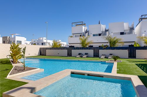 A quiet 2 Bedroom Townhouse within a gated community with triple pool area in the sought after area of Dona Pepa. A short walk is local bars and restaurants. Is also ideally located for walking into the town of Cuidad Quesada for a wider choice of eateries, shops and banks. The property is ground floor and has front and back outside space and also a rooftop solarium (not suitable for children). Inside all you need for a comfortable stay with hot and cold air conditioning, wifi and TV.