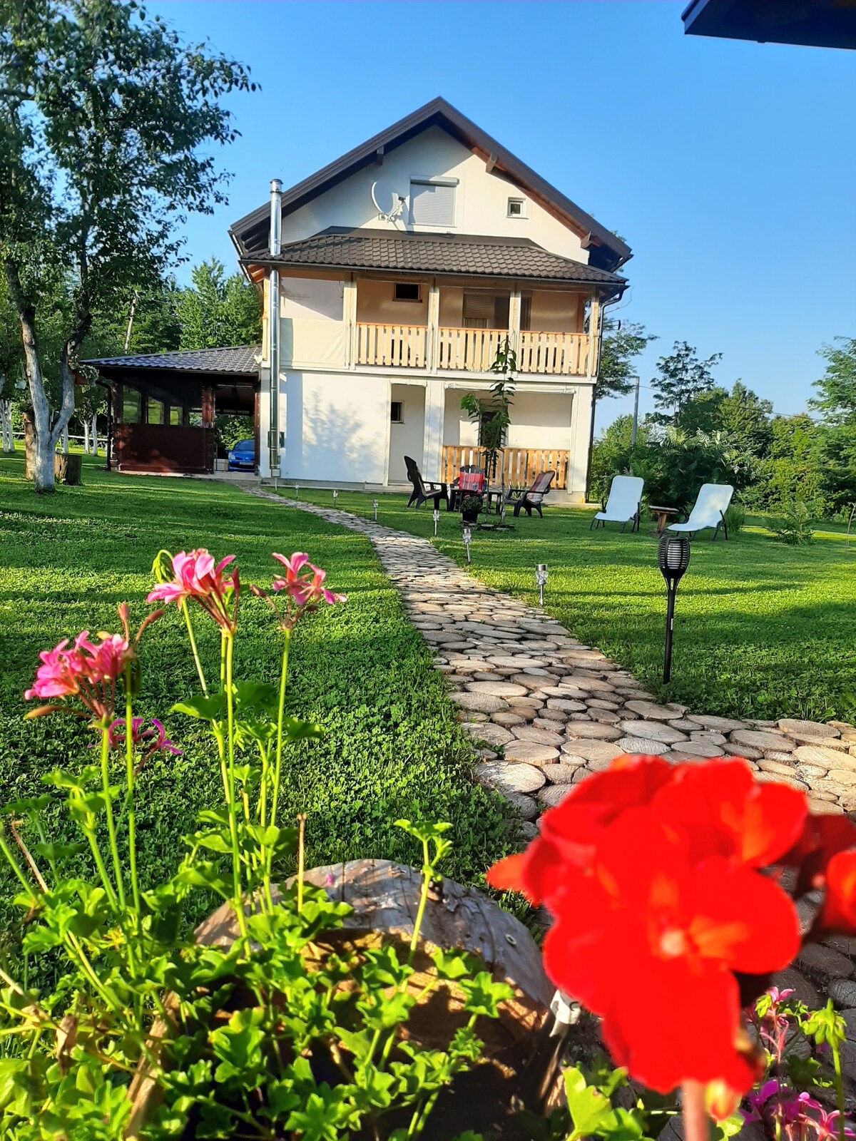 A VITA NATURA Estate egyedülálló természeti környezetben található a Plitvicei-tavak Nemzeti Park közelében, egy napsütötte dombon, amelyet csak béke és nyugalom vesz körül. A tágas réten található ingatlan a természetes anyagokból készült két faházból áll, és teljesen berendezett, egyedi, kézzel készített, tömörfa bútorokkal, amelyeket helyi kézművesek állítanak elő, ami különleges otthonosságot és melegséget kölcsönöz a háznak.😀