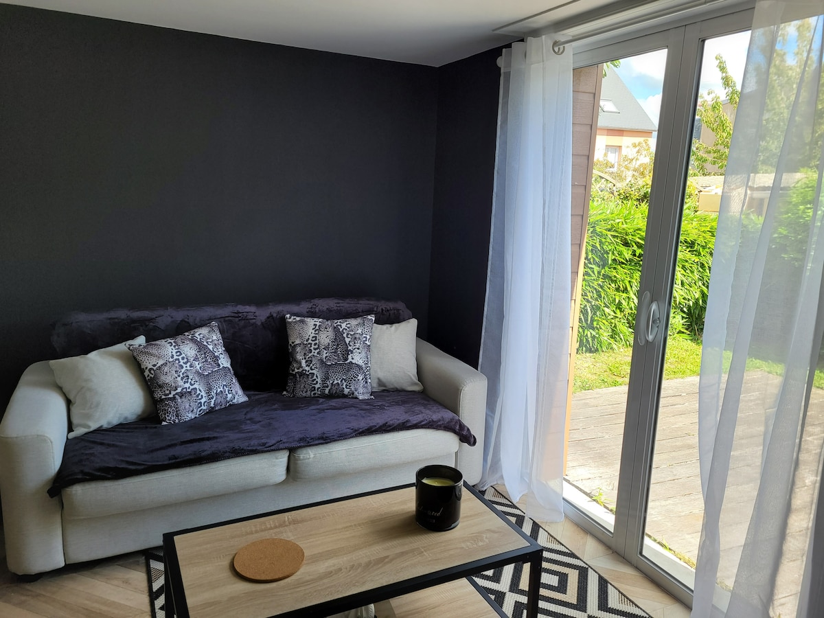 Békés és központi ház vadonatúj. Apartman 5 lépcsővel, déli fekvésű terasszal, 2 szobával, beleértve a nappalit - konyha kihúzható kanapéval, kényelmes szoba (king-size ágy) beépített fürdőszobával, külön WC. A privát teraszon asztal és székek, 2 napozás, elektromos terv található. Nagyon jó elhelyezkedésű: 350 méterre Donville les Bains strandjától, 10 perc sétára a vasútállomástól és Granville városközpontjától, 200 méterre a Dior kerttől.