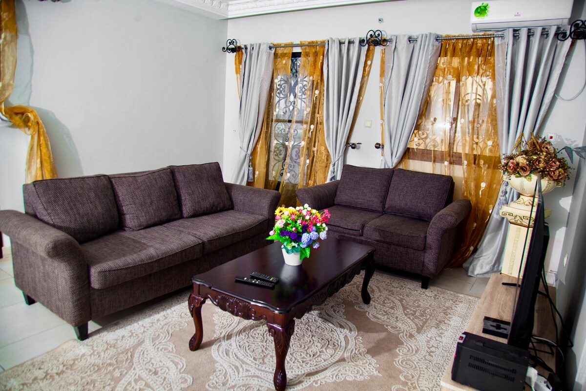 Teljesen felújított, világos szállásunk az afrikai és a nyugati elegancia ötvözete. Akwa szívében található, és gyors hozzáférést biztosít a város legjobb helyeihez. Élvezd a modern amerikai konyhát, a Starlink Wi-Fi-t (120 Mb/s), a külön irodát, az egyedi hangszigetelést integrált terelőkkel, az IPTV-t, a légkondicionálást és a generátort. Nonstop biztonság kamerákkal és széf, 5 csillagos tisztaság★ garantált.