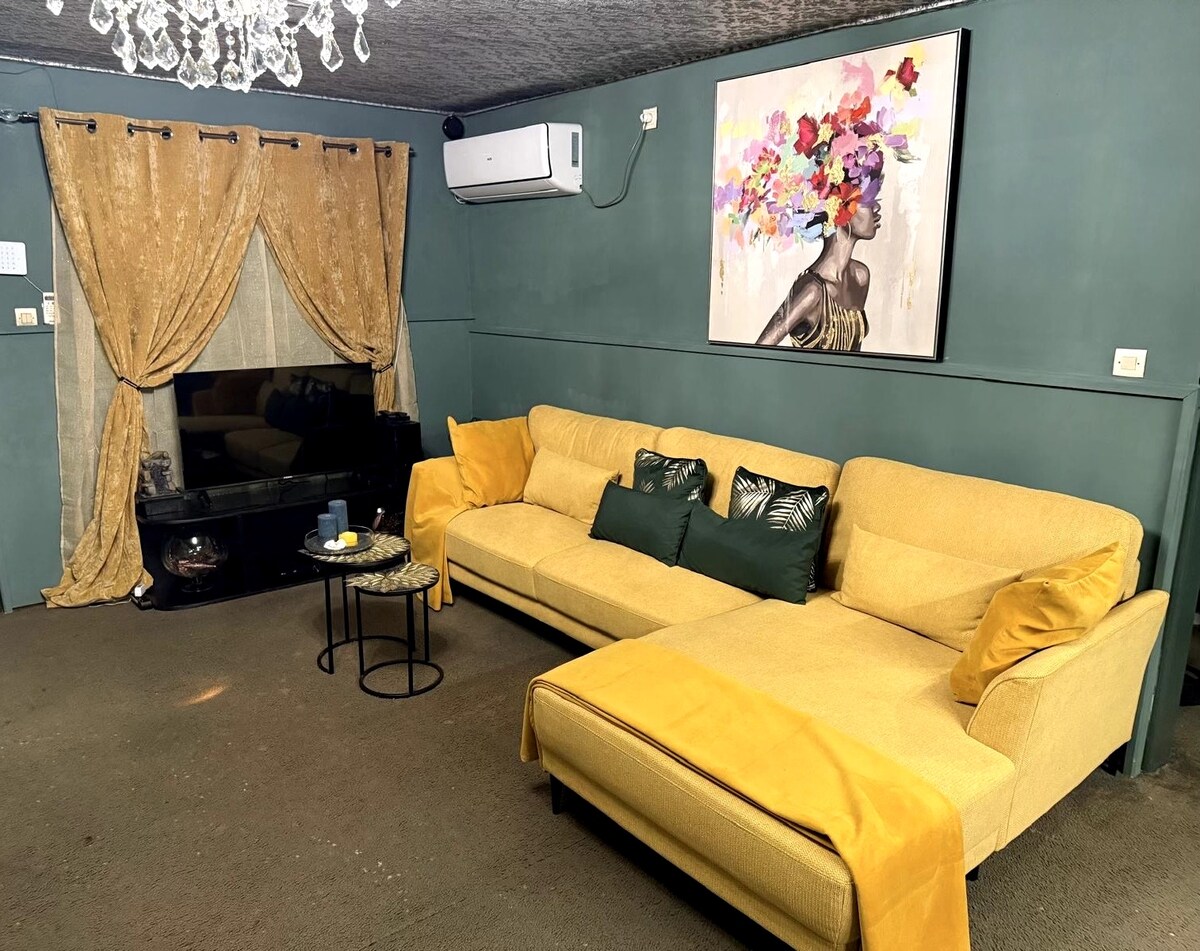 Ez az otthon ötvözi a modern dizájnt és a meleg kényelmet. Hangulatos nappalija kanapéval és színes párnákkal pihenésre hív, míg a nyitott, modern és funkcionális konyha mindent kínál, amire szükséged van a könnyű főzéshez. A központi elem a beépített világítással ellátott dizájner lépcső, amely egyedi és művészi hangulatot teremt. A nagy zöld növény és a fali tévé teszi teljessé ezt a harmonikus környezetet, amely ideális egy kellemes és emlékezetes tartózkodáshoz.