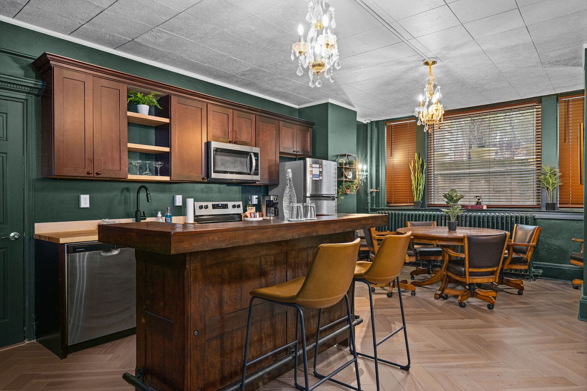 A Hidden Luxury Retreat Step behind the velvet curtain of time. The newly renovated Speakeasy Suite is a one-of-a-kind, lower-level luxury studio nestled within the historic 1908 Cotton Mansion. Designed with rich, bold colors and subtle vintage details,