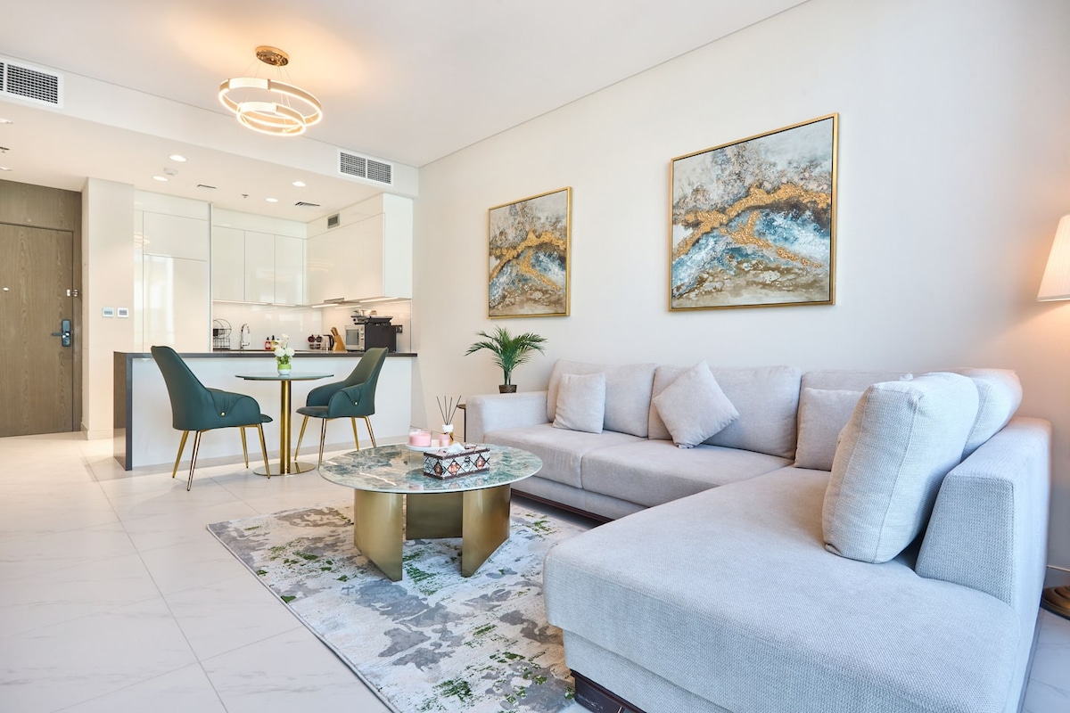Experience luxury on the 51st floor at the 5 Star Paramount Midtown Hotel and Residence, Dubai near Downtown and Metro. This stylish 2-bedroom, 2-bathroom 120 (sqm) apartment offers stunning views of the Burj Khalifa and ocean. Enjoy high class amenities, a fully equipped kitchen, and a cozy living room. Located in Business Bay, it's minutes from Dubai Mall and top attractions. Sleeps 8 (6 adults + 2 small kids). Includes high-speed Wi-Fi, TVs, private parking, and baby essentials upon request.
