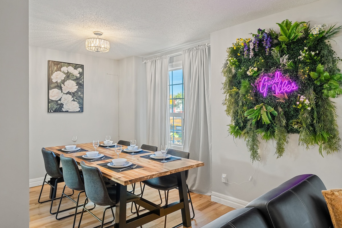 Amíg itt vagy, találsz egy stílusos és kiváló szállást Edmonton belvárosában, 1 jármű számára INGYENES földalatti/fűtött/biztonságos parkolási lehetőséggel. A tömegközlekedés, a Rogers Place, a City Center bevásárlóközpont, az éttermek, az italboltok és a River Valley közelében. Ultragyors Gigabit internet. Légkondicionálás az egységben. A New York Style 1 hálószobás, 2 teljes ágyas (Queen & Double) társasházi lakás mindennel rendelkezik, amire szükséged van, beleértve a saját mosodát, a Netflixet, a teljes konyhát minden alapvető dologgal. Tartalmazza a Sportnet-előfizetéses Watch Oilers & Jays játékait!