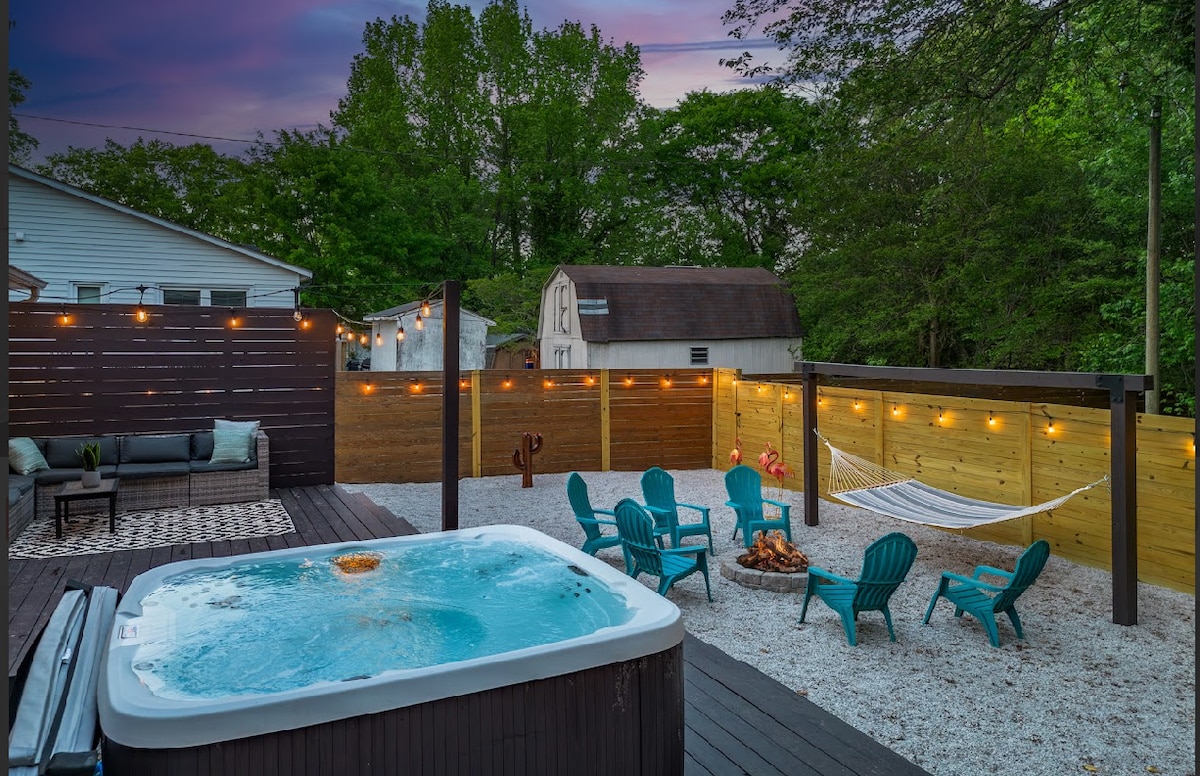 A hátsó udvarod oázisa Raleigh-ben! Élvezd a teljesen elkerített, pezsgőfürdővel, minigolfpályával, egyedi teraszfalal, tűzrakóhellyel, függőággyal, cornhole-lal, életnagyságú Connect 4-gyel és óriási Jengával felszerelt udvart, amely tökéletes egy felejthetetlen Raleigh-i kiruccanáshoz családdal vagy barátokkal. Mindössze 5 percre a belvárostól, a Red Hat amfiteátrumtól, a Walnut Creektől és a Duke Energy Centertől, valamint 10 percre az NC State-től. Szórakozás, kényelem és kényelem egyben!