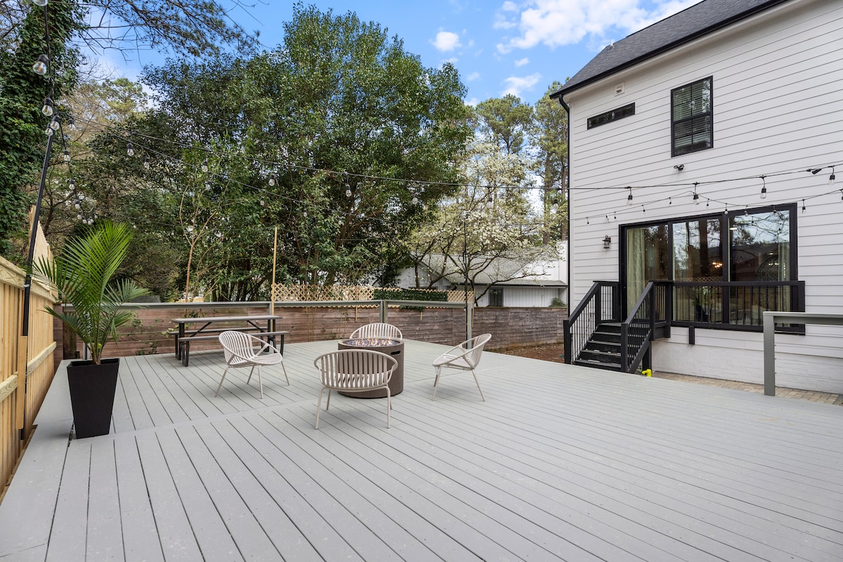 VADONATÚJ otthon Raleigh belvárosában, amely lehetővé teszi, hogy megcsodáld a város csodálatos látképét a rendkívül tágas, harmadik emeleti teraszról. Kevesebb mint 1 mérföldre a Raleigh Kongresszusi Központtól és 2 háztömbnyire a Transfer Co. Food Halltól, amely nagyszerű lehetőségeket kínál reggeli kávéhoz és bagelekhez, italokhoz, édességekhez és egyebekhez! Tökéletes szálláshely nagy csoportoknak és családoknak. ****VEDD FIGYELEMBE, HOGY BULIK ÉS NAGY ÖSSZEJÖVETELEK NEM ENGEDÉLYEZETTEK****