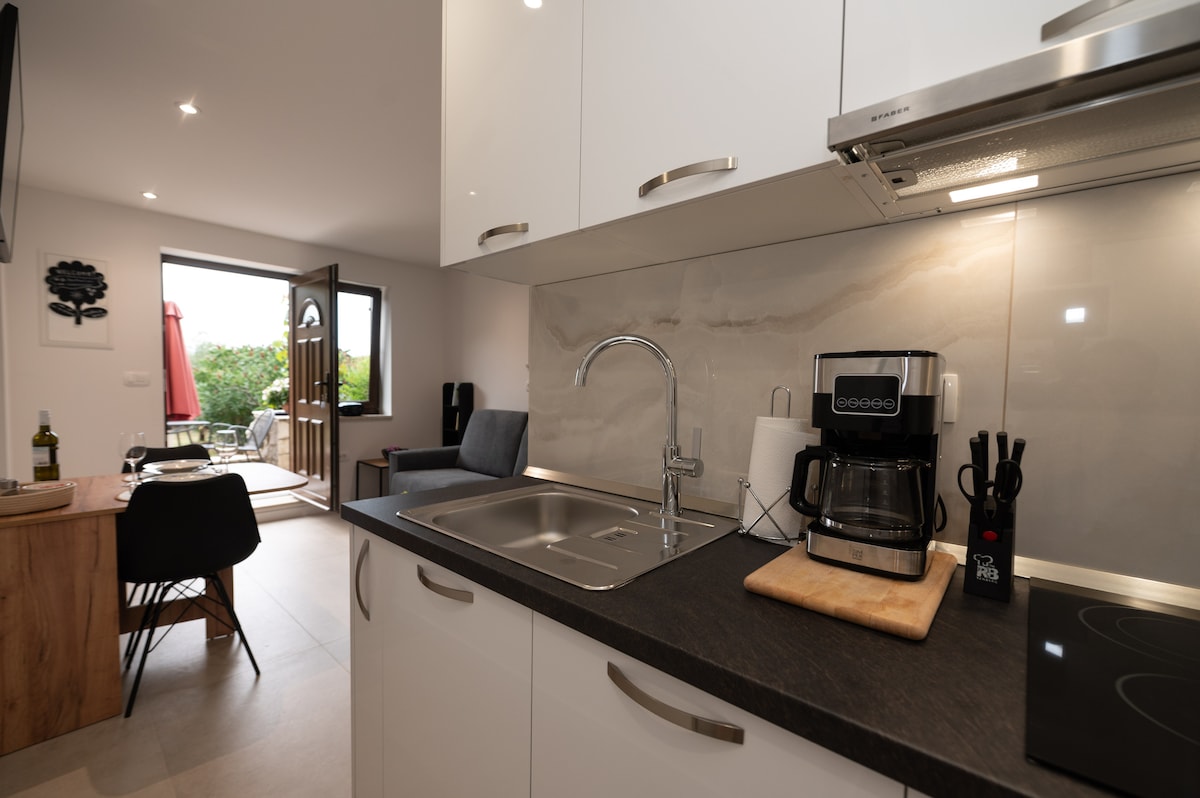 A lakás egy történelmi házban található, megpróbáltuk megőrizni egy kőből épült horvát ház egyedi báját, bár az egész belső tér és felszerelés rendkívül modern. 2 hálószoba, két fürdőszoba, nagy nappali és konyha. Minden szobában van légkondicionáló és száloptikás internet. A konyhánkról: sok energiát fektettünk bele, és helyreállítottuk az összes kőelemet. Van egy hangulatos terasz szőlőtetővel és egy ősi kúttal. Ez egy 6 perces séta a lépcsőn lefelé a partig.
