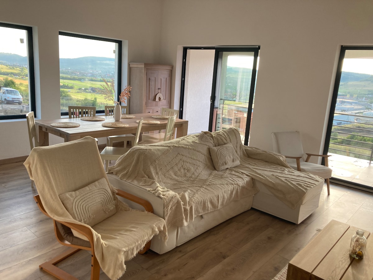 Ez a pihentető ingatlan percekre a várostól lélegzetelállító kilátást nyújt a hegyekre. Egy új lakóövezetben található, kilátással a Szekelyudvarhelyre, ahonnan panorámás kilátás nyílik egészen Sukóig. Élvezd a luxust és a kényelmet az egész családdal. Tapasztald meg a békés naplementéket egy gyönyörűen berendezett teraszon. A saját konyhád kényelmét élvezheted mindennel, amire szükséged van, kávét és teát, amikor megérkezel. Wifi díjmentesen, kiságy/etetőszék kérésre rendelkezésre áll. A szabadtéri fitnesz/park 3 perces sétával elérhető!!