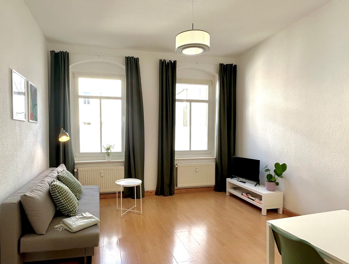 Stílusosan berendezett Gründerzeit apartman erkéllyel a Drezdai Neustadtban. A világos lakás csendes helyen, a Kunsthofban található, kis üzletekkel, galériákkal és kávézókkal körülvéve.