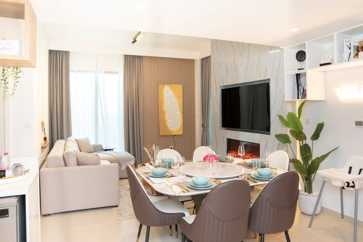 Luxury living in Port de La Mer! Enjoy a King-size Four Seasons bed with premium mattress & linens, sofa bed for 2, safe vapor fireplace, Dyson hairdryer, DeâLonghi coffee machine & yoga mat. The dining table doubles as a workspace. Pool, parking & private beach access included. Steps from the sea, cafĂ©s nearby, 15 min to Dubai Mall & 20 min to the airport â perfect for guests seeking something special!