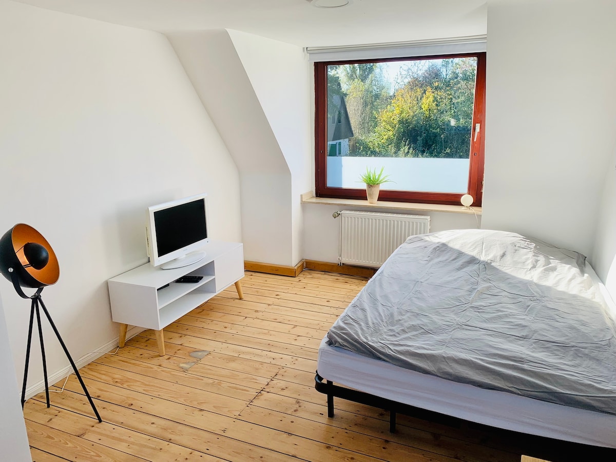Bútorozott lakás, kb. 65 m2, két családi ház, 1. emelet. Felszerelt konyha, fürdőszoba ablakkal és káddal/zuhanyzóval, nappali, hálószoba 180 cm-es franciaággyal 2 fő részére és kanapé (140 cm) egy felnőtt vagy 1-2 gyermek számára. Közös használata a kertben, a mosógép/szárító az alagsorban, ingyenes parkolás , csendes lakóterület D-Dél, tömegközlekedés összeköttetésben: S-Bahn állomás Eller-Süd könnyen megközelíthető gyalog vagy busszal (723/732 vonalak). Szállás párok, üzleti utazók és családok számára