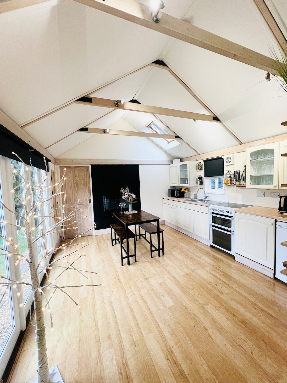 Nemrég díszített, tölgyfa keretes melléképület, amely nagy, nyitott terű társalgóból, étkezőből és konyhából áll. Zuhanyzó kézmosóval és WC-vel. Az emeleten, kényelmes kétágyas hálószoba. (Két egyszemélyes ágyra alakítható) Extra kanapéágy áll rendelkezésre a földszinten, hogy a szálláshely akár 4 vendég elszállásolására is alkalmas legyen. Megbízható wifi és hely a távmunkához. Kicsi, diszkrét privát terasz. Privát parkolás. Közel a golfpályához és a falu központjához. Vedd körül magad stílusosan ebben a különleges térben.