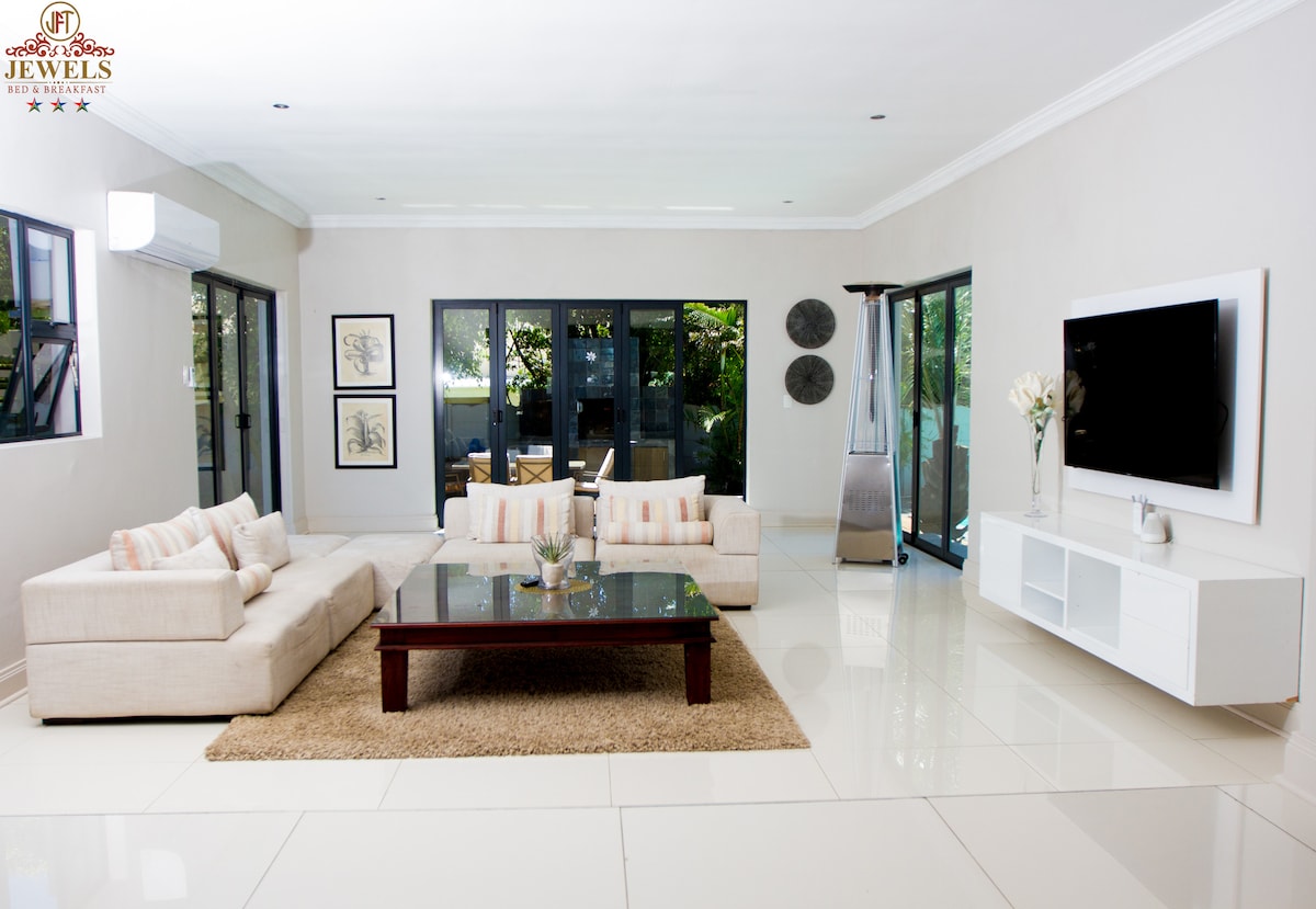 Otthon az otthontól távol, biztonságos környezetben, CCTV-vel a parkolóban és riasztórendszerekkel. Önellátó létesítmény tágas, 3 fürdőszobás hálószobával, extra mosdóval, társalgóval és konyhával. Alkalmas családnak vagy baráti társaságnak. Tágas szabadtéri szórakozóhely és úszómedence a kikapcsolódáshoz. Biztonságos parkolás legfeljebb 6 autó számára. Közel a kényelmi szolgáltatásokhoz és a Bonza Bay Beachhez. A Wi-Fi éjjel-nappal elérhető. A munka és a szórakozás még terheléscsökkentéssel is folytatódhat, mivel inverter is rendelkezésre áll.