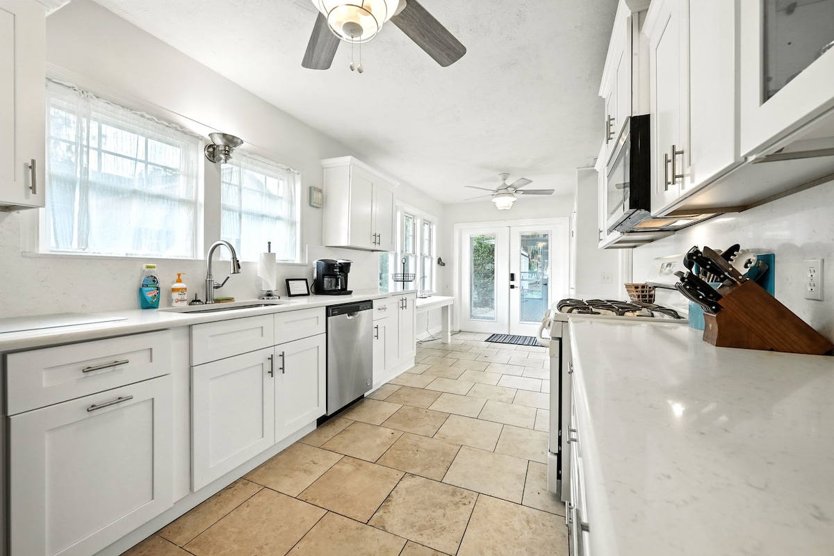 Gyönyörű, fából készült vendégház. Kiruccanás több hektáron, fákkal övezett területen. Tágas, tágas szoba otthonos kunyhó hangulattal, 2 hálószobával és 2 teljes fürdőszobával. Teljes konyha és mosoda. A bejárati verandán, a kövezett kocsibehajtón és a parkolóban vetített. Újonnan telepített működő hurrikán redőnyök! Közeli éttermek & sok étterem belül 10 mérföld. Remekül használható gyalogláshoz, túrázáshoz vagy kerékpározáshoz. Pihenjen és élvezze a falvak vásárlási és éttermi kínálatát, de térjen vissza a békéhez, a szépséghez és a nyugalomhoz.