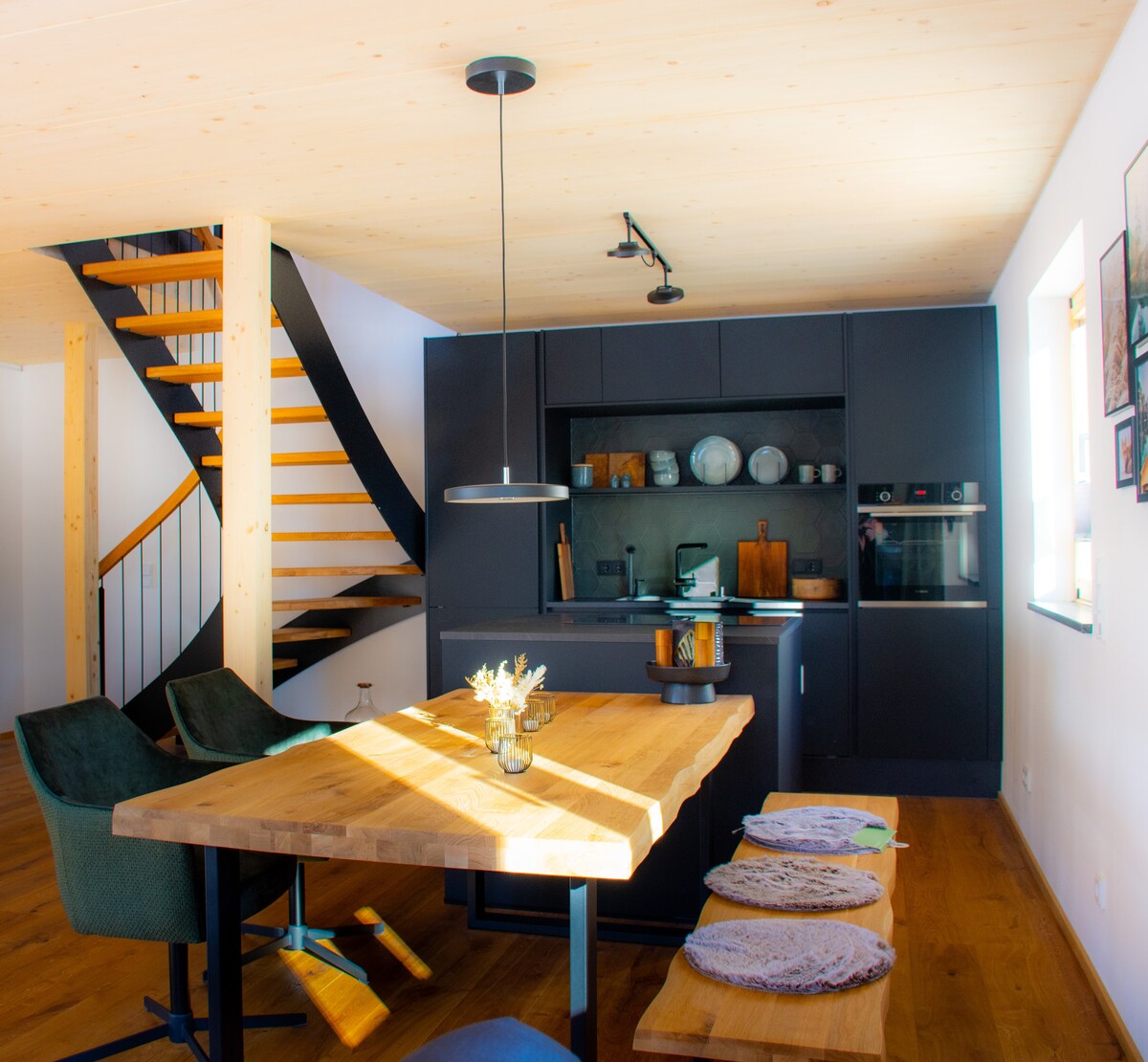 Nyaralónk egy tágas, fényárban úszó, önálló építészeti ház, nagy tetőterasszal és purista kerttel egy domboldalon. A tetőteraszról csodálatos panorámás kilátás nyílik az Alpokra és a Zugspitzére. Házunkban egy teljesen felszerelt, nyitott konyha vár rád. A pihenéshez ingyenesen használható infravörös gőzkabin és pezsgőfürdő áll rendelkezésre. A ház klímabarát, napelemes rendszerrel, akkumulátoros tárolóval és levegős hőszivattyúval.