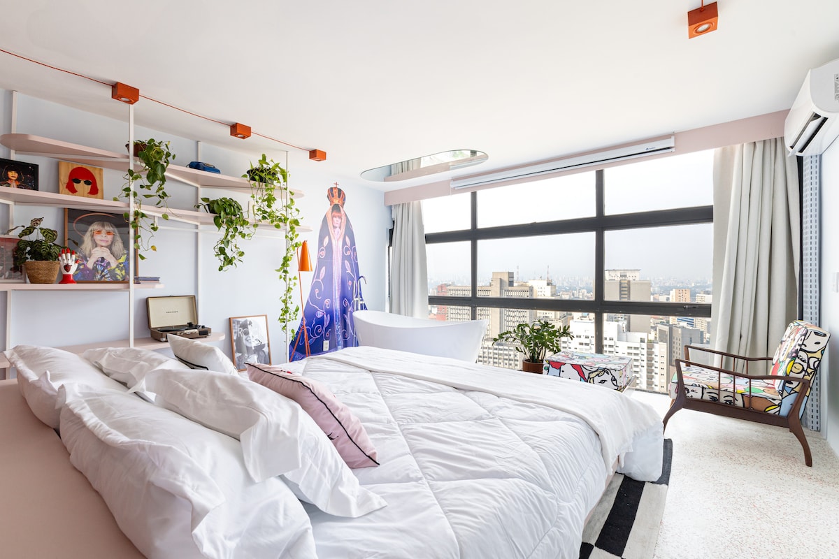 Studio on the 35th Floor of Mirante do Vale, the building of #SampaSKy. A @yanaina_interiors tervezte a Rock királynőjének tiszteletére. Rita Lee egy olyan lakás minden részletében jelen van, amelyet azért készítettél, hogy lefeküdj azokkal, akiket szeretsz: egyedi fényképek; lemezek; életrajzi könyvek; egyedi csempe; Your Hits; „Santa Rita” és még a hippi vörös poharak is. Mindezt egy olyan környezetben, amely a következőkből áll: King Bed; Immersion Bathtub; Flowers; 100º Phone with HD projection; Full Kitchen and Panoramic View.