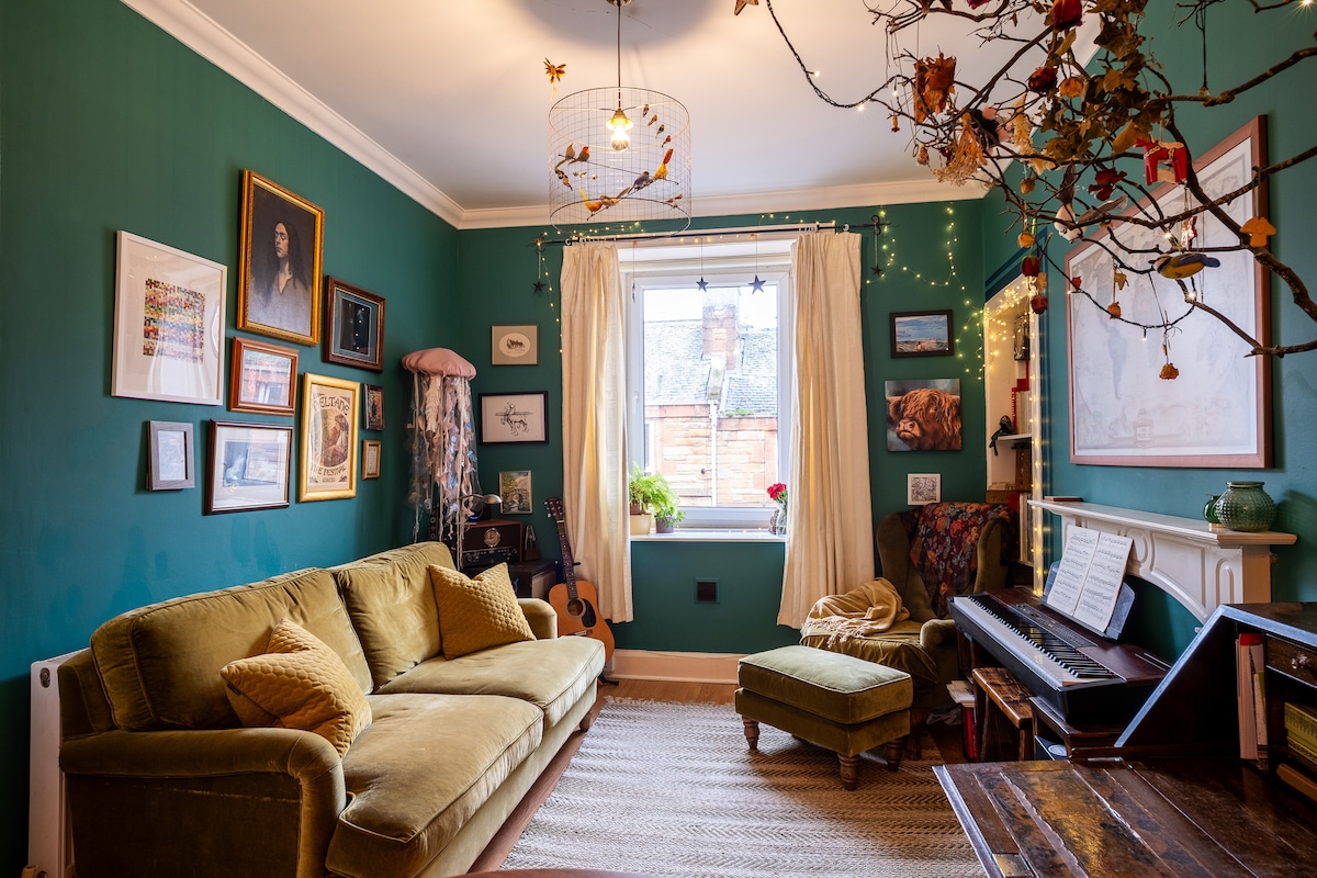 Centrally located, this 2 double bedroom ground floor main door apartment, has a lush, artsy feel within a pretty and quiet, traditional tenement crescent, with free street parking for your car, and many buses into the city. Walking, its 25 mins from Waverley train,3 mins to Holyrood Park, Arthur's Seat, the Palace of Holyrood, and Royal Mile, are 15 minute. In the other direction the trendy city beach of Portobello with prom, cafes, artisan shops, 25 min walk away.