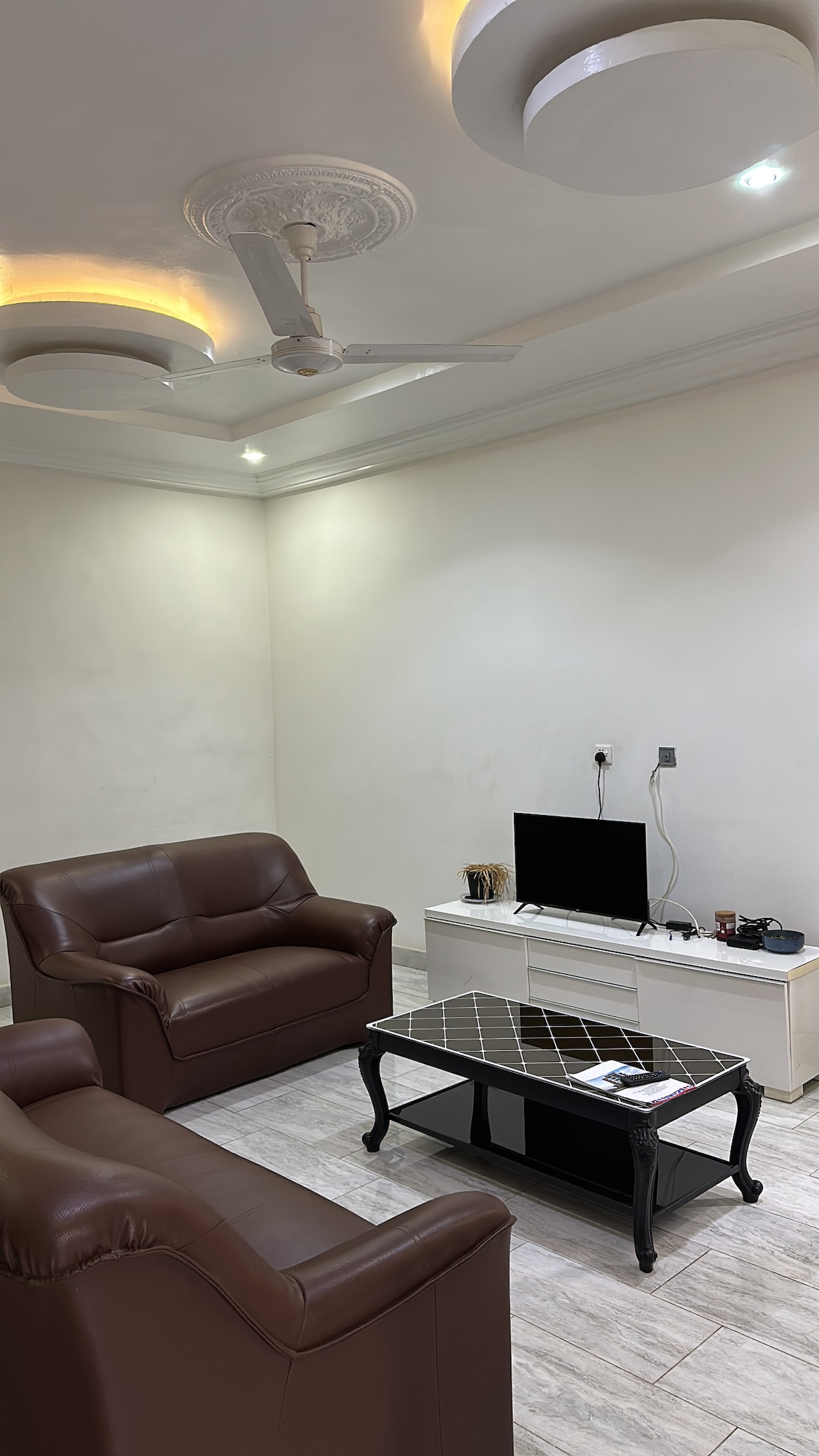 Érezd jól magad az egész családdal ezen a stílusos helyen, amely makulátlanul stílusos és berendezett, hogy megfeleljen a családodnak és az előkelő életstílusodnak. Élvezd a 2 hálószobás, 3 ágyas, wifit, társasjátékot, szobabiciklit, nagy tévét, az erőteljes mélysugaras basszust, a légkondicionált és teljesen berendezett konyhát. Ez a lakás 5 perces autóútra található a Knust csomóponttól, kevesebb mint 20 percre az Adumtól, 3 percre a SG bevásárlóközponttól, és stílusos és királyi irodával rendelkezik.