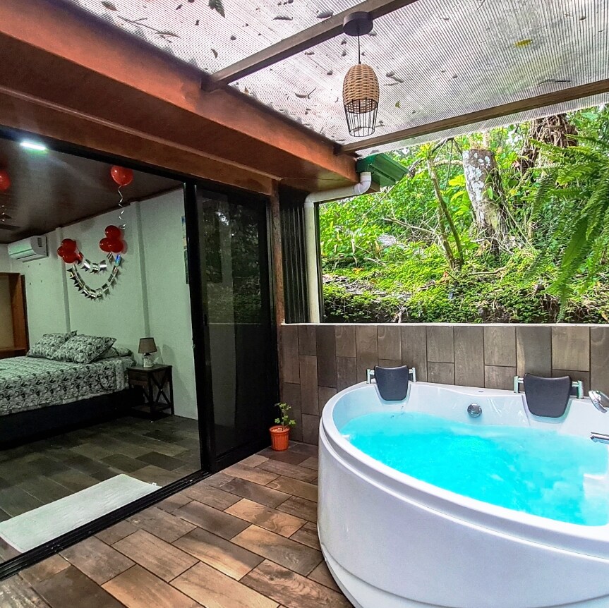 Cozy room with a king bed and a private outdoor jacuzzi, ideal for couples. Located in El Castillo, close to restaurants, supermarkets, and La Fortuna's main activities: hot springs, Lake Arenal, the National Park, canopy tours, and more. Views of the Arenal Volcano from the entrance, and the soothing sound of the river from the jacuzzi. Perfect for unwinding after a day of adventure.