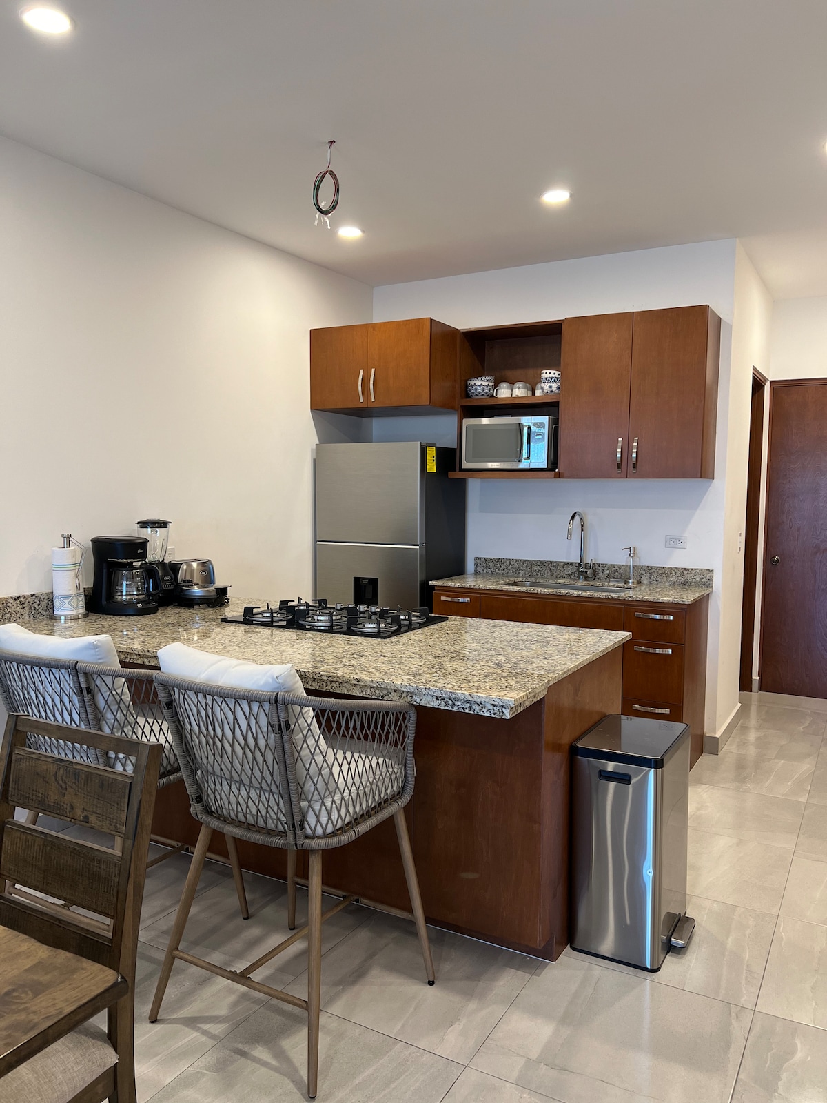 Cómodo y seguro alojamiento ideal para 4 personas. Ubicación inmejorable: a 4 min de La Marina, 5 min de Playa El Médano Completamente climatizado, con - 2 habitaciones con camas king size, - 2 baños completos, - Cocina equipada - Terraza. Áreas comunes con - Piscina, - Asador, - Roof Top - Estacionamiento gratuito - Elevador - Cerradura electrónica para llegada autónoma. A 35 min del aeropuerto (SJD). Contamos con una cámara de seguridad exterior en la entrada principal.