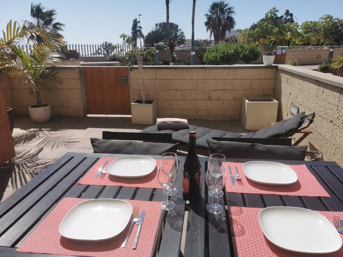 Modern és hangulatos lakás két hálószobával, két teljes fürdőszobával, az egyik a főszobában, nappali, teljesen felszerelt konyha és a hegyre néző terasz, ingyenes Wi-Fi-vel, parkolóval és két medencével a La Tejita strand közelében található új komplexumban.