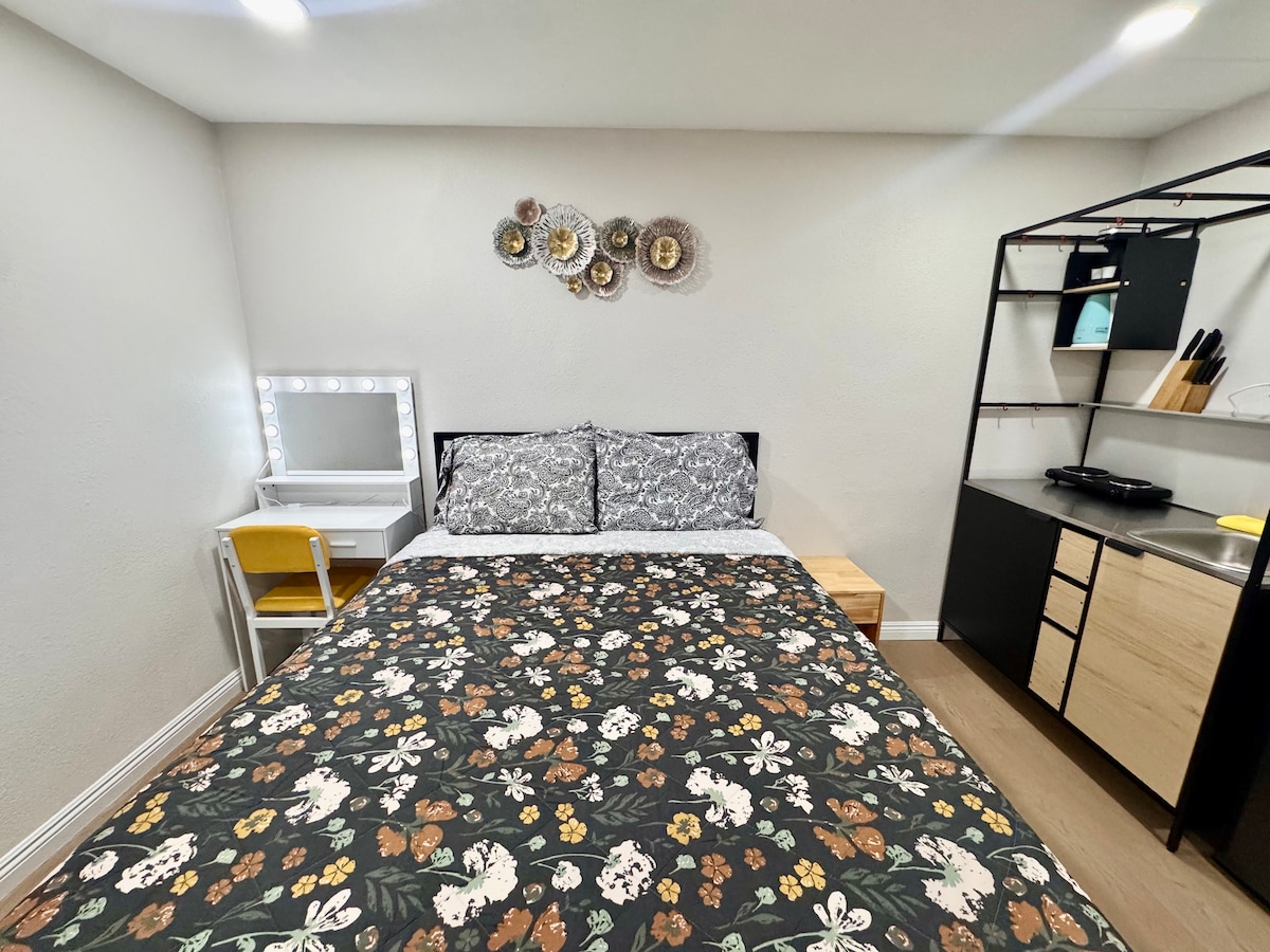 Hangulatos privát stúdió El Monte szívében, modern dizájnnal és átgondolt kényelmi szolgáltatásokkal. Élvezd a kényelmes franciaágyat, az okos tévét, a Wi-Fi-t és a kávéval/teával felszerelt konyhasarkot. Központi helyen, autópályák közelében – 25 perc alatt elérheted LA-t, Pasadenát és Arcadiát. Csendes környék könnyű parkolással, saját bejárattal és alapvető kellékekkel. Tökéletes pároknak, egyedül utazóknak vagy szakembereknek, akik kényelmet, kényelmet és pihentető tartózkodást keresnek.