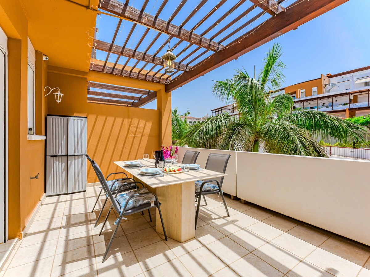 Welcome to our cozy seafront home in Oasis del Sur, Tenerife! Overlooking the tranquil waters of Golf del Sur, our attached town-house offers a peaceful escape for families, couples or friends seeking serenity. Relax and unwind in our well-decorated and functional space, complete with two double bedrooms, two shower rooms, and a sun-drenched terrace perfect for soaking up the sun. Take a dip in the seawater heated pool or catch up on your favorite shows with the Smart TV and high-speed WiFi.