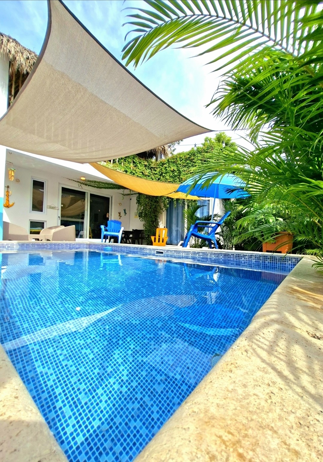 Casita tipo rancho minimalista (NO DE LUJO!) con cocinita y piscinita. Es cómoda con luz y ventilación natural, pérgola adyacente para relajarse frente a la piscina. Dormitorio y sala amplia, con 2 camas Queen y 2 sofá camas incorporados. Perfecto para parejas, familias pequeñas o MAX 6 adultos. Excelente ubicación central en la parte hotelera, pero aislada para pasársela tranquilo. Bares/restaurantes a pocos pasos y una tiendita a 15 mtrs. A 1.5 cuadras de la playa.