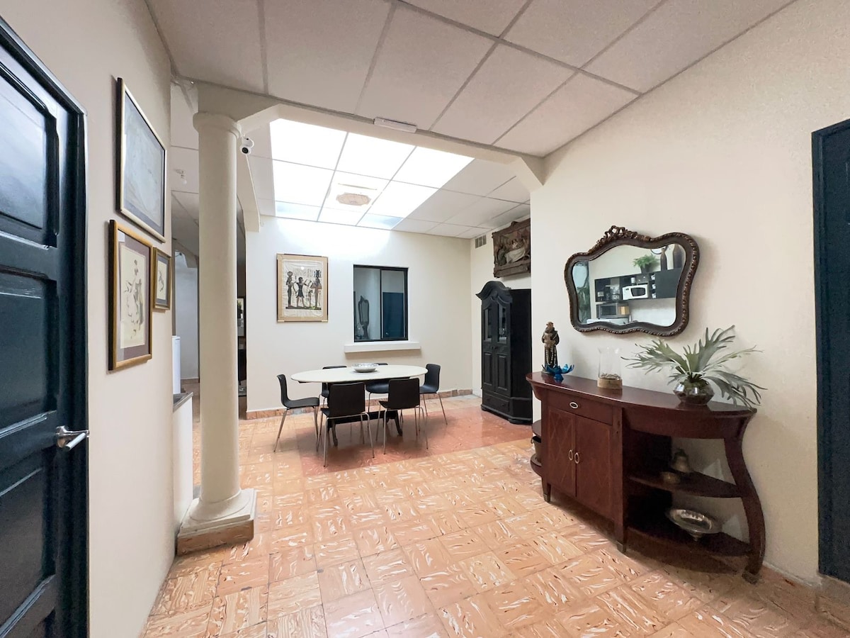 Welcome to your urban oasis, a private studio nestled between the prestigious districts of San Benito and Escalón. This quiet retreat for up to 3 guests offers a modern and comfortable stay, perfect for work or relaxation. Its central location, provides unbeatable access to high-end restaurants, cafes, and malls. Enjoy AC, a kitchenette, and shared laundry, all within a serene, tree-filled environment. A truly peaceful and convenient home away from home.