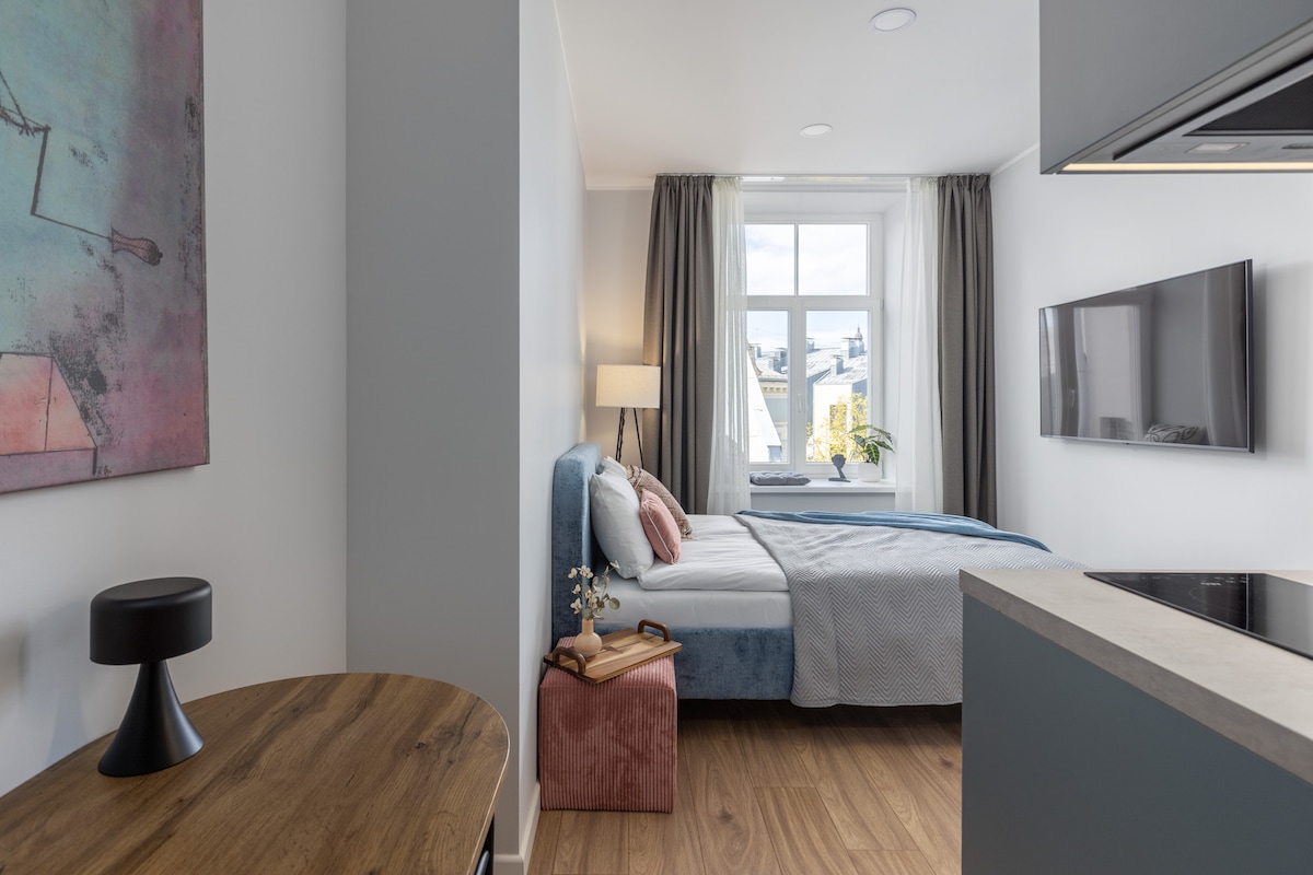 Parkra néző modern stúdiólakás Riga belvárosában