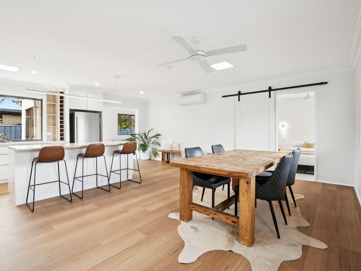 ULTIMATE BEACH HOUSE - JAW DROPING OCEAN AND ISLAND VIEW. A premier Emerald Beach címen található, mindössze egy laza, 200 méteres sétára a strandtól és a helyi kengurukkal, falusi kávézókkal, éttermekkel és üzletekkel. Élvezd a gyönyörű északi partvidéki időjárást egész évben a hatalmas beltéri-kültéri bár étkezővel, a padlótól a mennyezetig érő homokkő kandallóval (fával), az üreges tolóajtókkal, amelyek zökkenőmentesen nyílnak az északi tájolású fedett szórakoztatóipari teraszra.