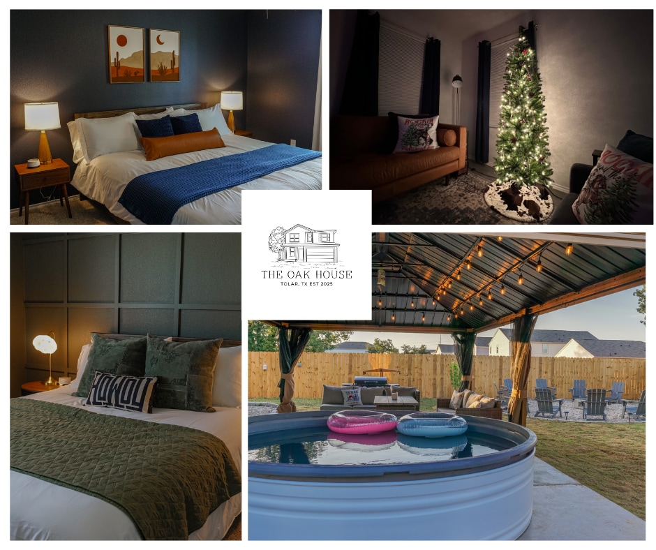 Üdv a The Oak House-ban, ahol a modern kényelem találkozik a vidéki bájjal! Ez az új építésű otthon tele van kényelmi szolgáltatással mindenkinek – még a szőrös családtagoknak is! Pihenj a napenergiával fűtött cowboymedencében, miközben a gyerekek játszanak a játszótéren. Éjszaka élvezd a csillagokat a város fényeitől távol. Az Oak House mindössze 15 percre található a Granbury Square-től/Lake Granbury-tól, 28 percre a Dinosaur Valley State Parktól és 27 percre a Tarleton State University-től. Küldj nekünk üzenetet, ha különleges ünnepi árakat szeretnél!