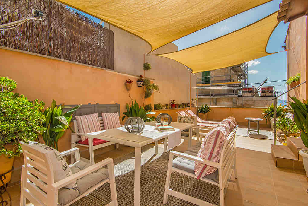 Lovingly renovated Majorcan village house with patio and roof terrace in SantanyiThrough the generous living and dining room with open kitchen on the ground floor you enter the patio, which offers relaxation space on 2 levels. In the rear part of the ground floor there is a cozy double bedroom with water bed, a bathroom and a small single bedroom. Upstairs there is another living room with mini-kitchen, a double and a single bedroom plus a bathroom with shower.