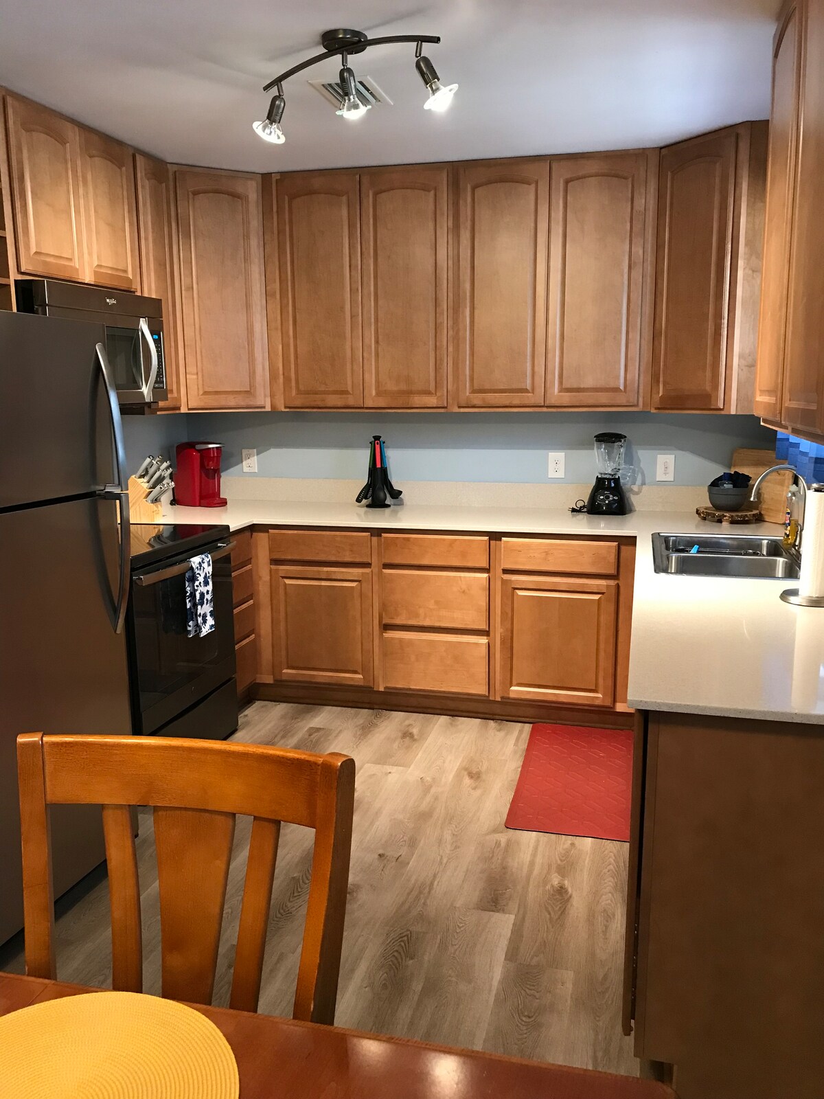 Our home features a large master suite and two guest bedrooms. The master suite includes a desk (for when work is absolutely necessary), and all bedrooms have their own tv with cable. Wireless, high-speed internet is available throughout the home. The kitchen is fully stocked with all the tools you need to cook your own delicious meals and is open to the dining and living areas. A washer and dryer are available in the garage.