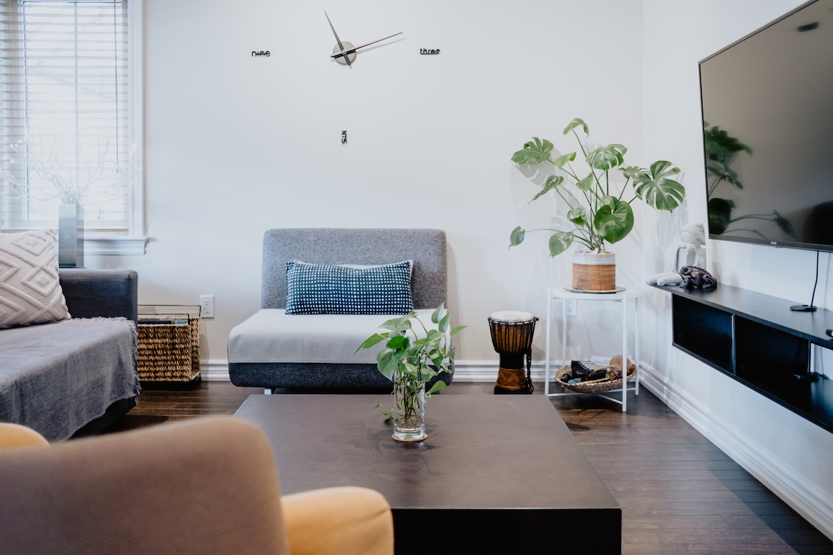 Üdvözlünk hívogató otthonunkban! Fedezd fel tágas, földszinti, egy hálószobás lakosztályunkat ingyenes parkolással. A családok számára ideális, nemdohányzó lakosztályunk teljesen különálló bejárattal büszkélkedhet, amely biztonságos és nyugodt környéken található. Csak 10 perc autóútra a Pearson repülőtértől, és kényelmesen közel a Great Canadian Casino Resort Toronto, a Toronto Congress Centre és a Humber College (északi campus) közelében. A tömegközlekedés (TTC) 3 perc sétára van. SAJNÁLATOS MÓDON DOHÁNYZÓKAT NEM TUDUNK FOGADNI.
