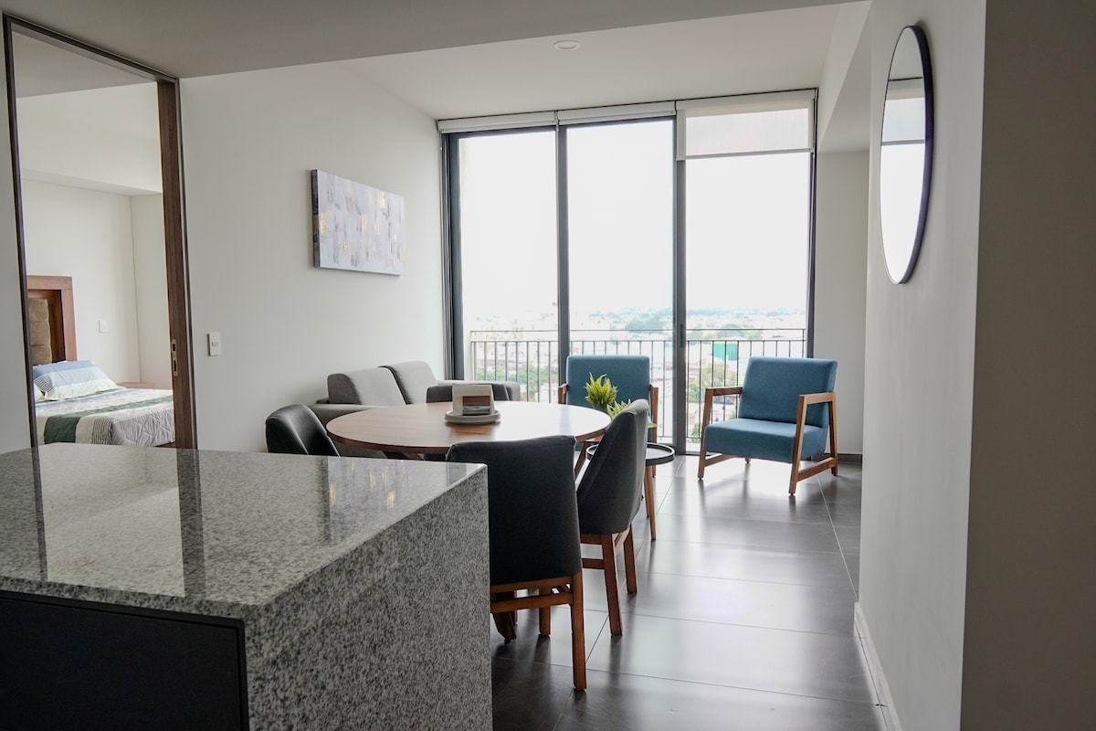 Modern new apartment with a stunning city view of Guadalajara. Located in a secure tower with 24/7 security and private parking. Only 5 min from Expo Guadalajara, 8 min from La Minerva, and 10 min from Chapultepec and the American Consulate. Perfect for business trips or leisure stays: families, groups, and professionals. Enjoy 2 bedrooms, 2.5 bathrooms, a bright living room, fully equipped kitchen, and fast WiFi for work or relaxation.