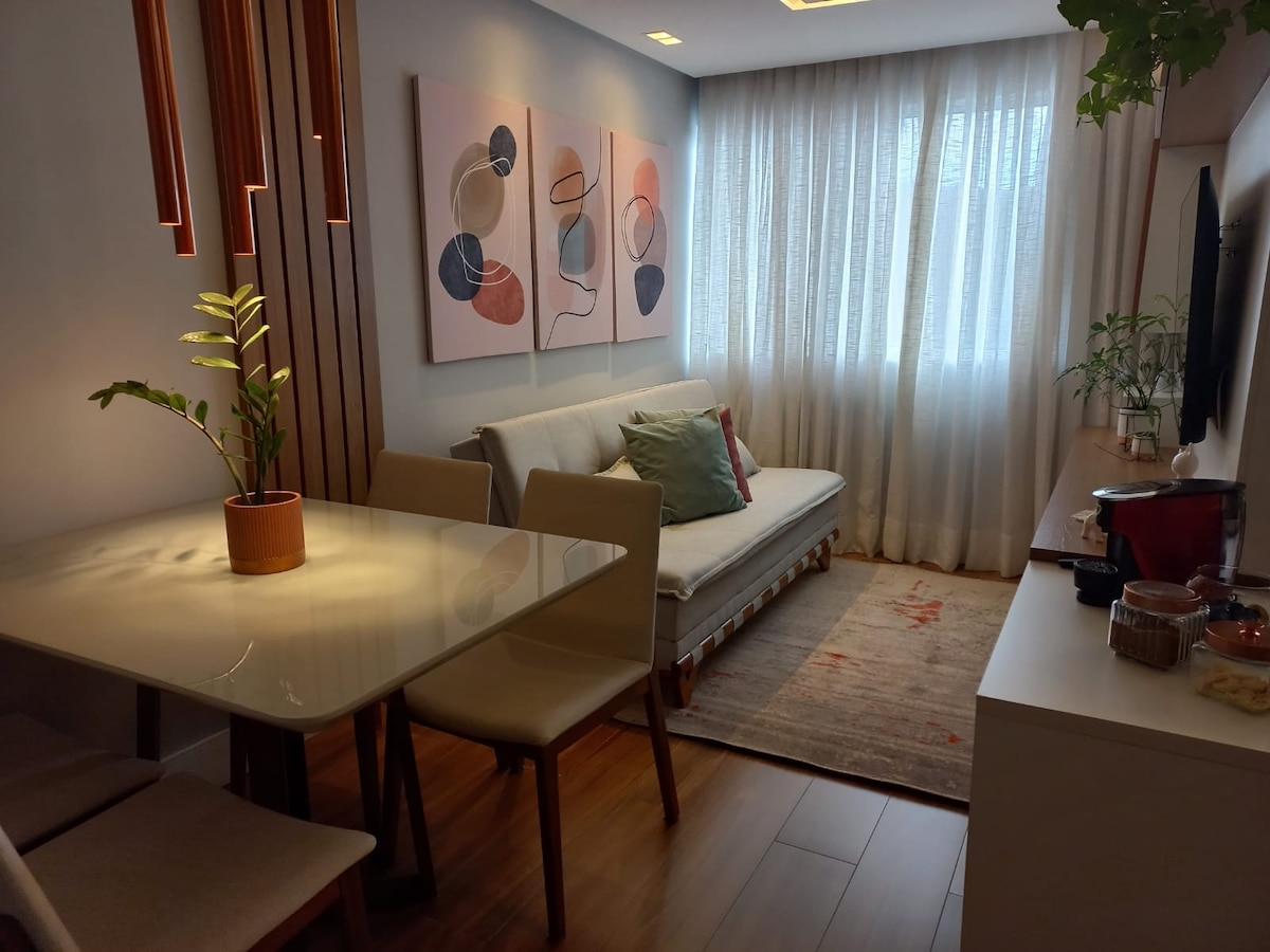 Apartamento completo todo planejado. Cozinha c/ coifa, microondas, forno, cooktop, geladeira, armários planejados, cozinha equipada para sua estadia (pratos, talheres, xícaras, copos, travessas, panelas, garrafa de café e demais utensílios essenciais para uma estadia confortável. Mesa com 4 cadeiras, SMART TV 50', sofá confortável, dois quartos, sendo um com duas camas de solteiro e um com cama de casal. Quartos com guarda roupas e cortina com blackout. Máquina lava/seca. Roupas de cama e banho.